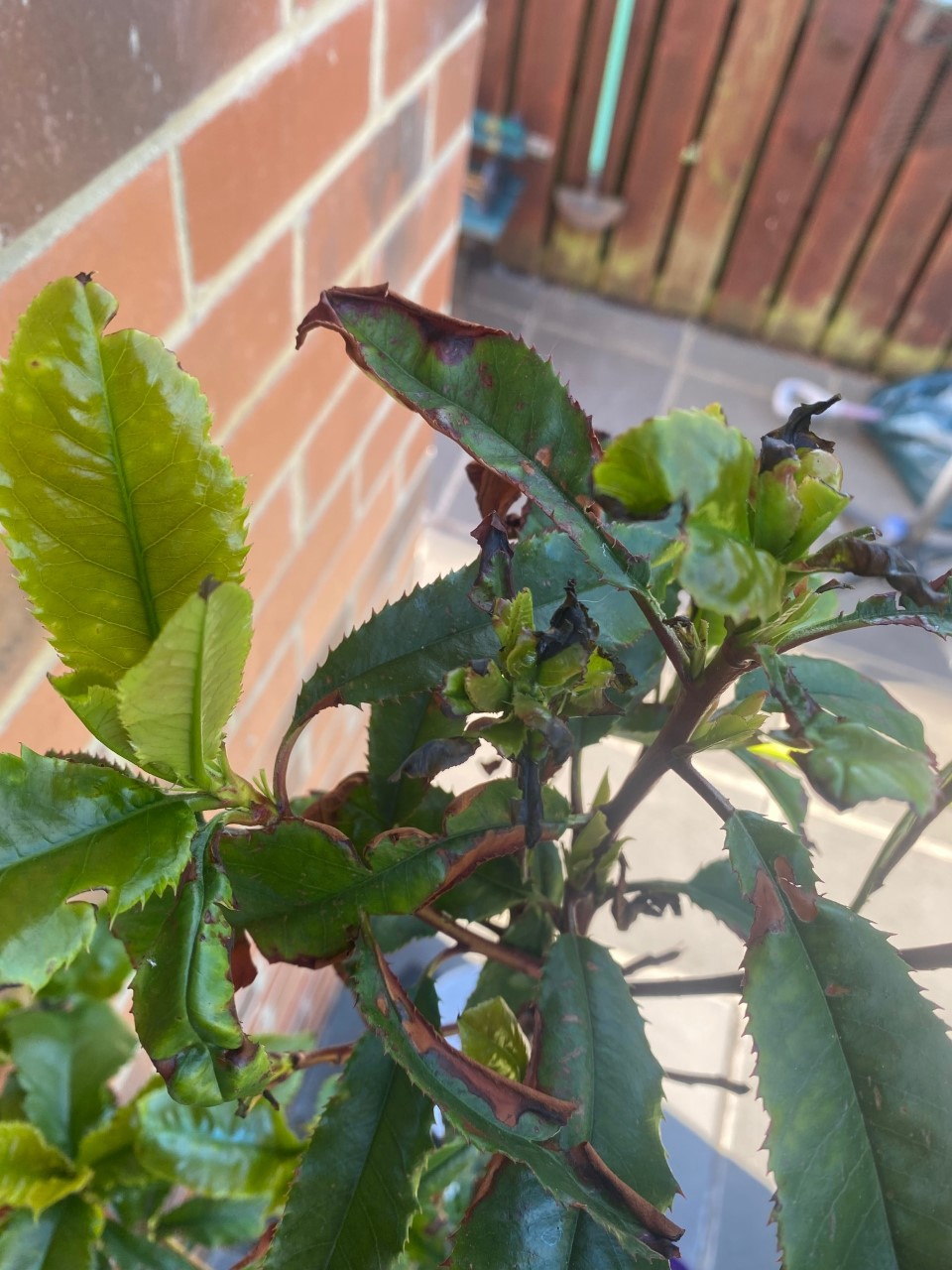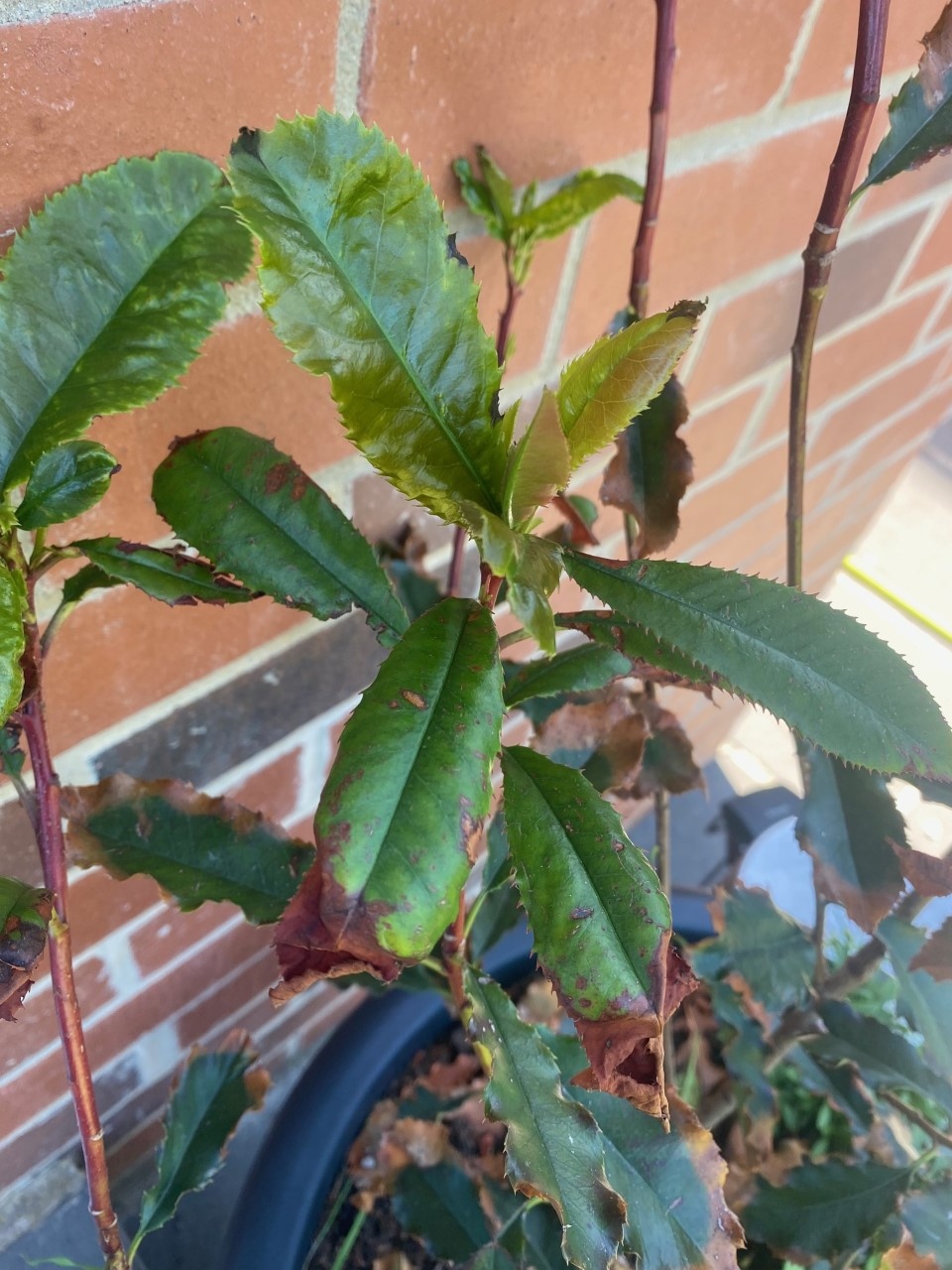 Hello! Can someone please help with my photinias. Both are, and have been, like this from day one. My dad first put them in my borders but because they were so unhappy we moved them to tubs in a better location for more sunshine (when we get it). I thought we had cracked it with the new healthy leaves but even they are now starting to go black, Leaves further down are lifeless and just fall off. Can we save them at all?! Best wishes, John.