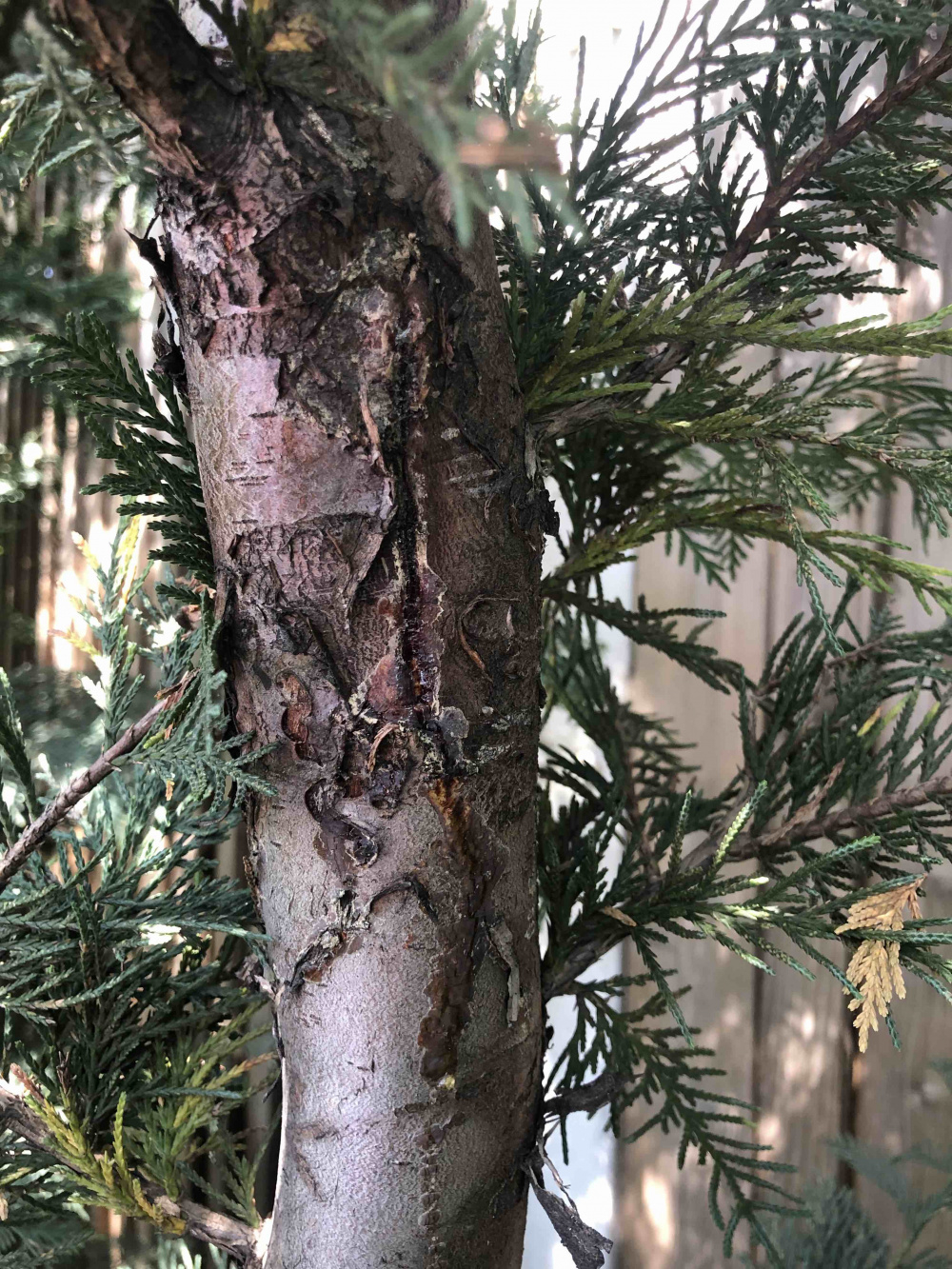 Upon closer inspection I noticed that one of the trees was weeping sap, a couple had long thin wounds on the main trunk and another had a wound on the underside of a branch.