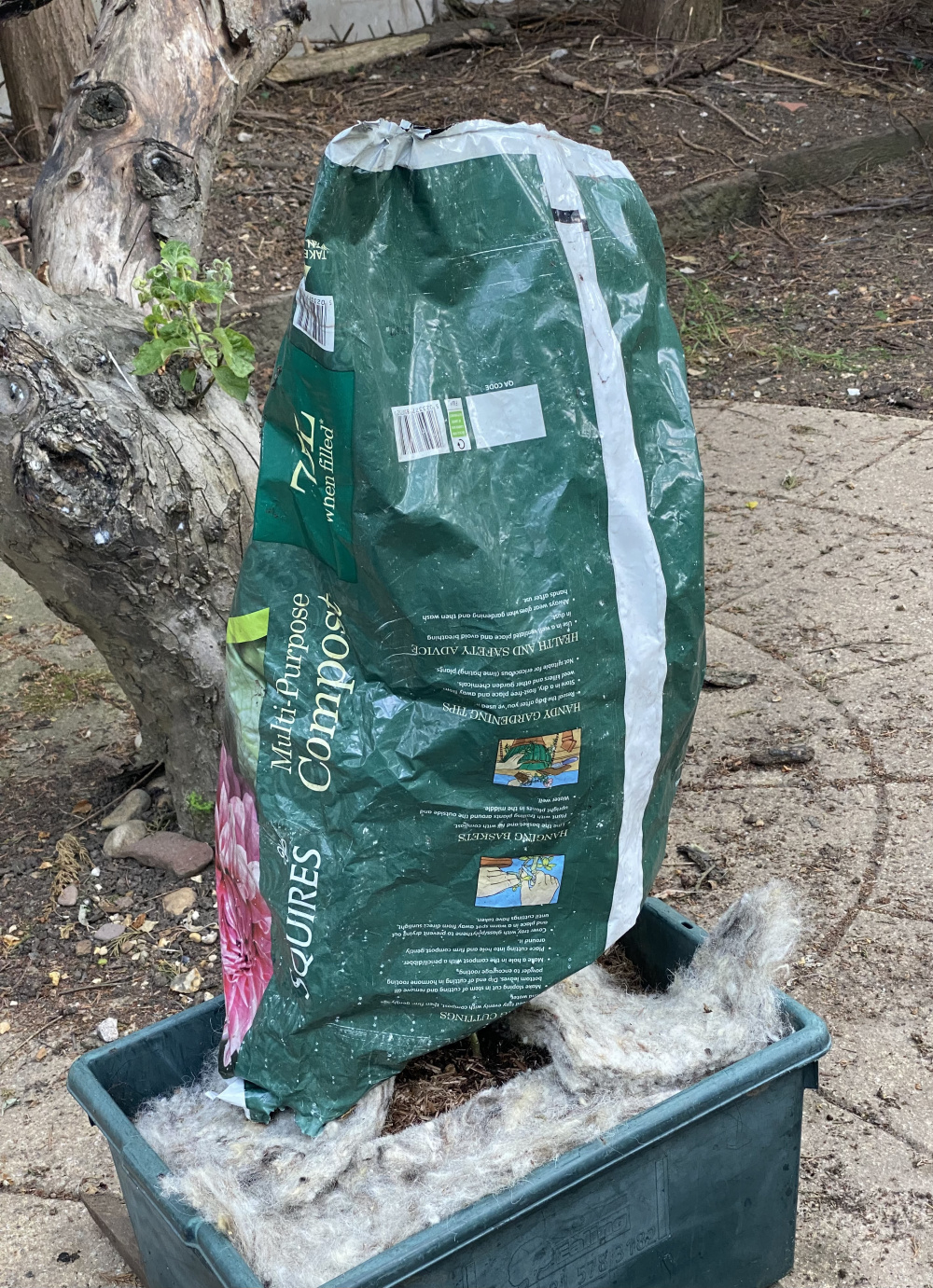 And here’s my solution to protecting it from tonight’s impending storm (also given it some good mulch)