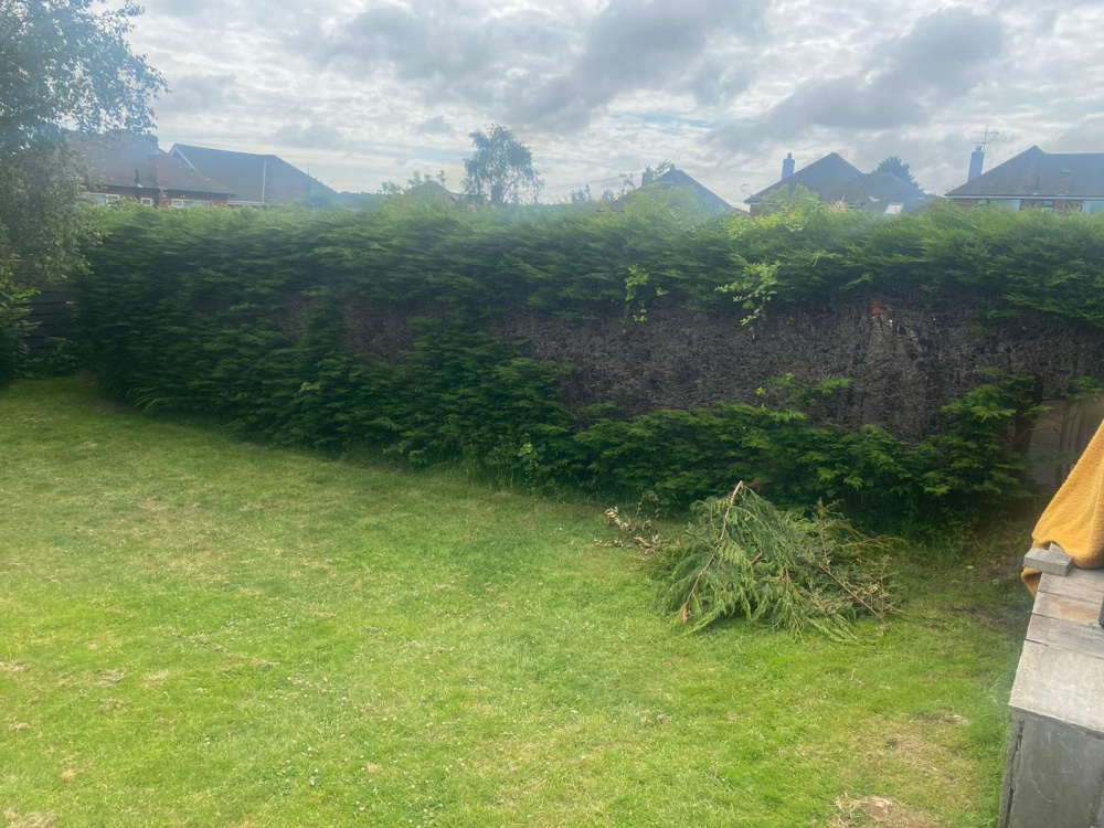 By the way, if you do go down the above route, when removing the hedge leave long enough trunks to rock them back and forth and loosen the roots ... they're not deep rooted trees (that's why they impoverish the soil around them) and are pretty easy to remove. Don't let a 'landscaper' just chop them off at ground level with a chain saw ... the stumps take an age to rot down and the roots will make it difficult to plant anything.