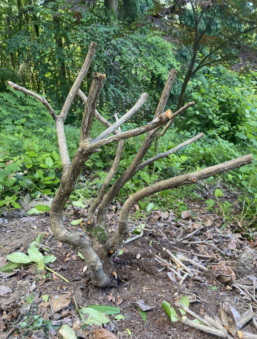 There's also lots of native shrubby and spreading plants that need to be cleaned up from under these rhododendrons which probably will give them more air, light and nutrition so hopefully cuts will re-grow back. Right now it's a very stale and damp den .