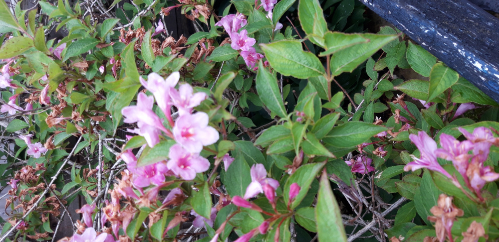 The flowering shrub is Weigela. Prune after flowering, best to remove some of the old wood as it flowers best on the new growth. Grows easily from cuttings too if you need more