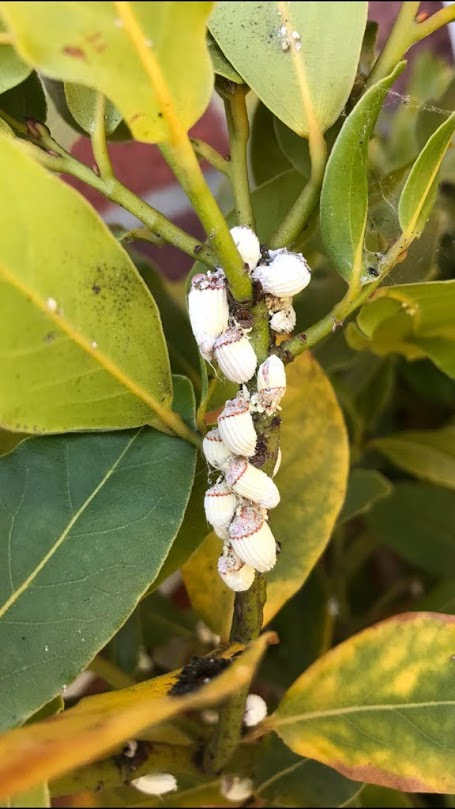 These are on my friends Bay Tree, any idea what they are and if they are harmful, they look like butterfly cocoons