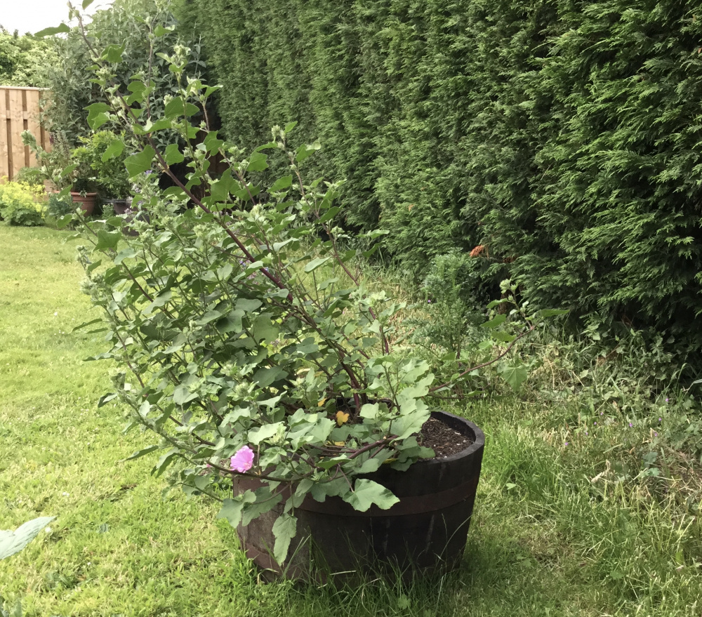 I popped a small lavatera olbia rosea into a large barrel in the spring (it was previously in a bought 2 ltr pot) and it has grown massively but is leaning very badly. It is planted on the eastern side of the garden, receiving around 8 hours of sun a day.