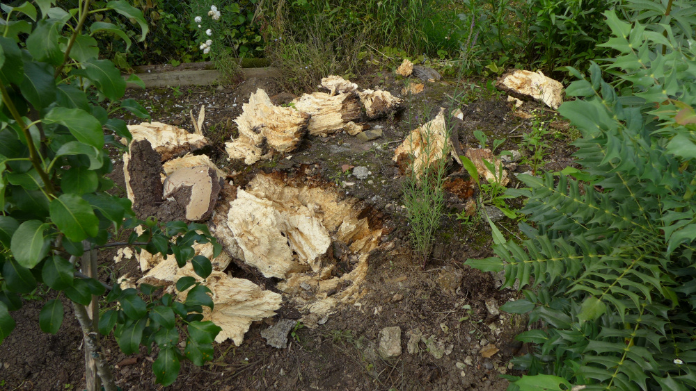 The 5ft wide stump has been an annoyance ever since with enormous fungi at the sides which now appear to have died back leaving brown rusty spores all over the place.