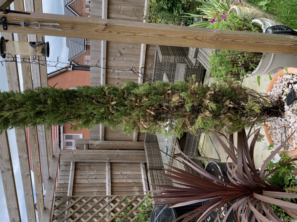 I am rather new to gardening and having just moved into our first house we bought 2x Cypress trees which we have placed into pots around 4 months ago. They seemed to be doing fine but over the past couple of weeks they have started to turn slightly brown and the lower portions have started to droop. I have attached pictures for reference.