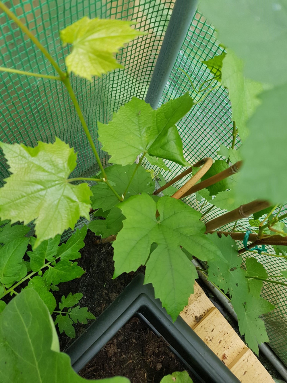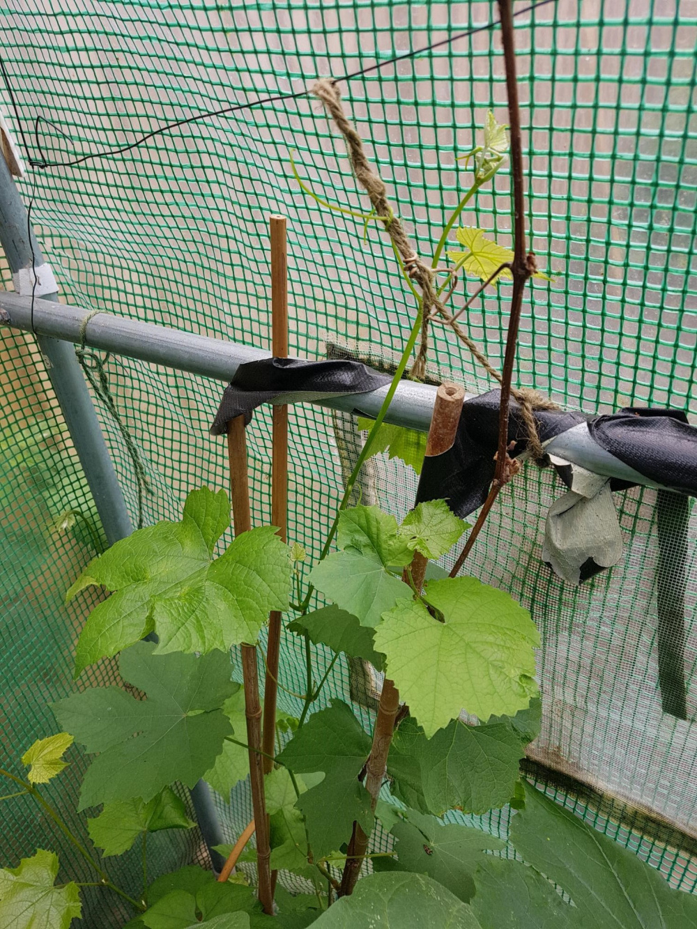 I have had my vine in the ground for coming up 2 years now, the root is outside and the vine is inside my polytunnel, it seemed to start well apart from leaves turning brown due to hot weather last year, I have used a liquid horse manure to feed it, and mulched it over winter, however it seems to be struggling to grow, it is now about a metre tall and very green, it is well watered, but it just does not appear to be happy, any suggestions?