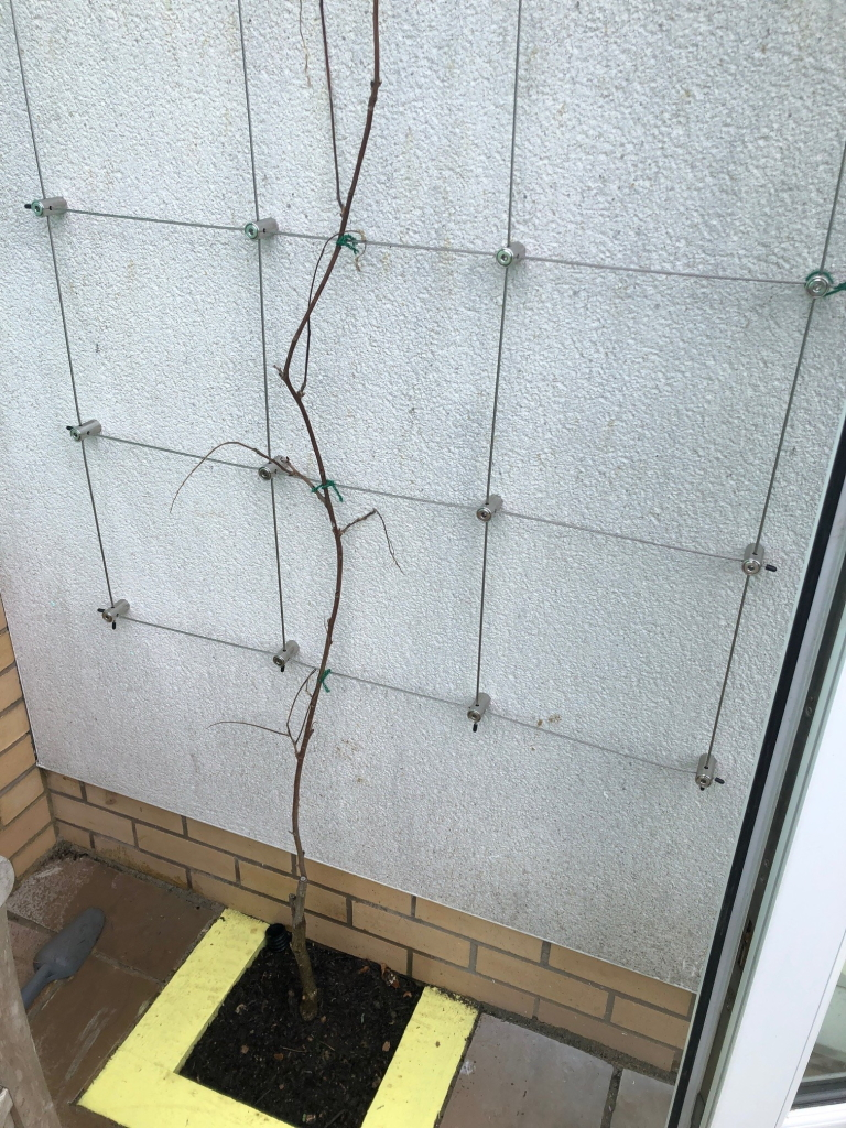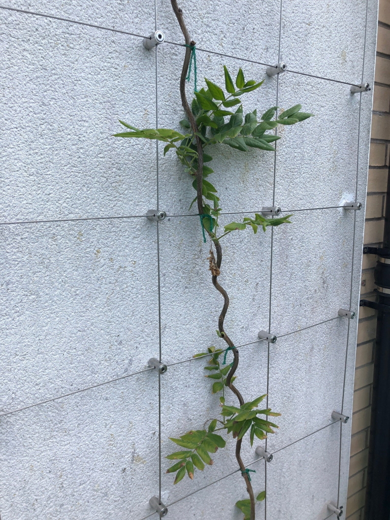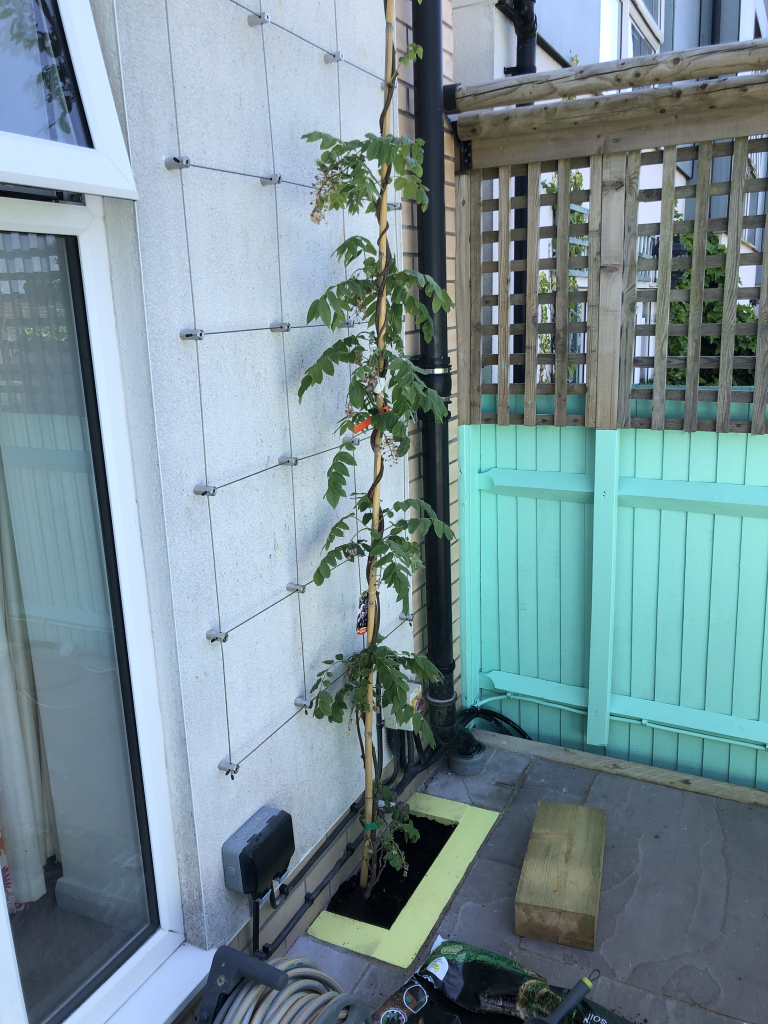 We recently started renovating our garden and bought two types of wisteria to be planted by the house wall to grow up a wire trellis.