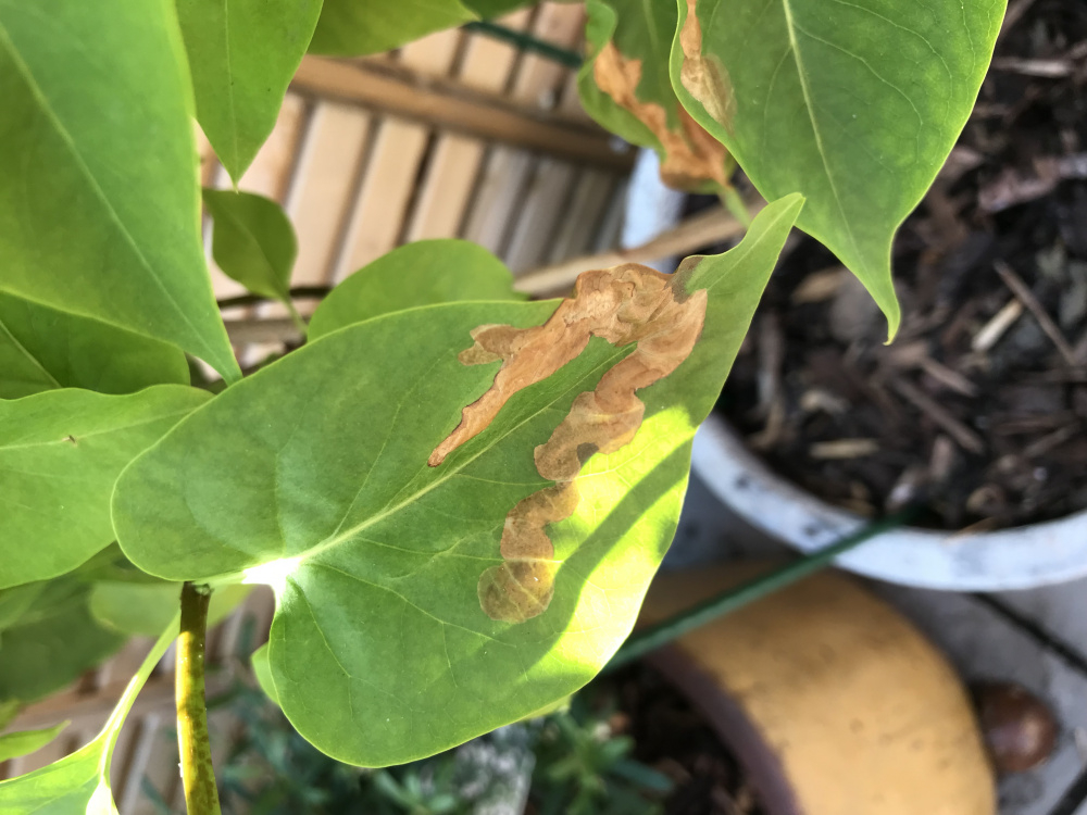 Hi. I have a small, compact lilac shrub in a decent sized pot. Just lately it has developed light brown patches on some leaves (as photo shows), almost blister like.