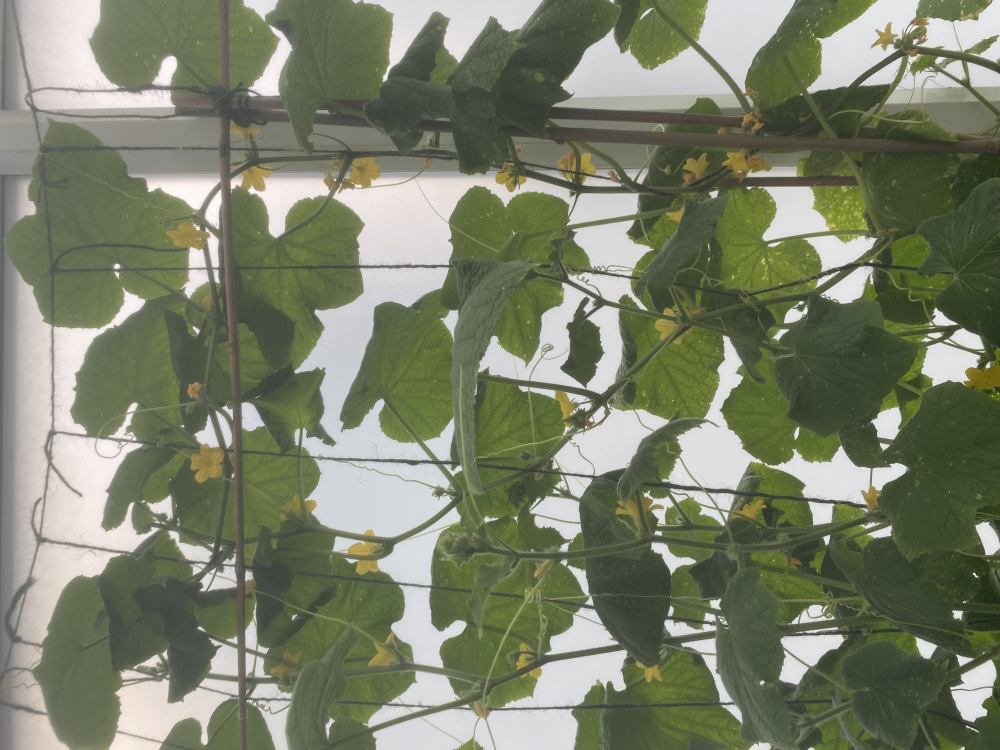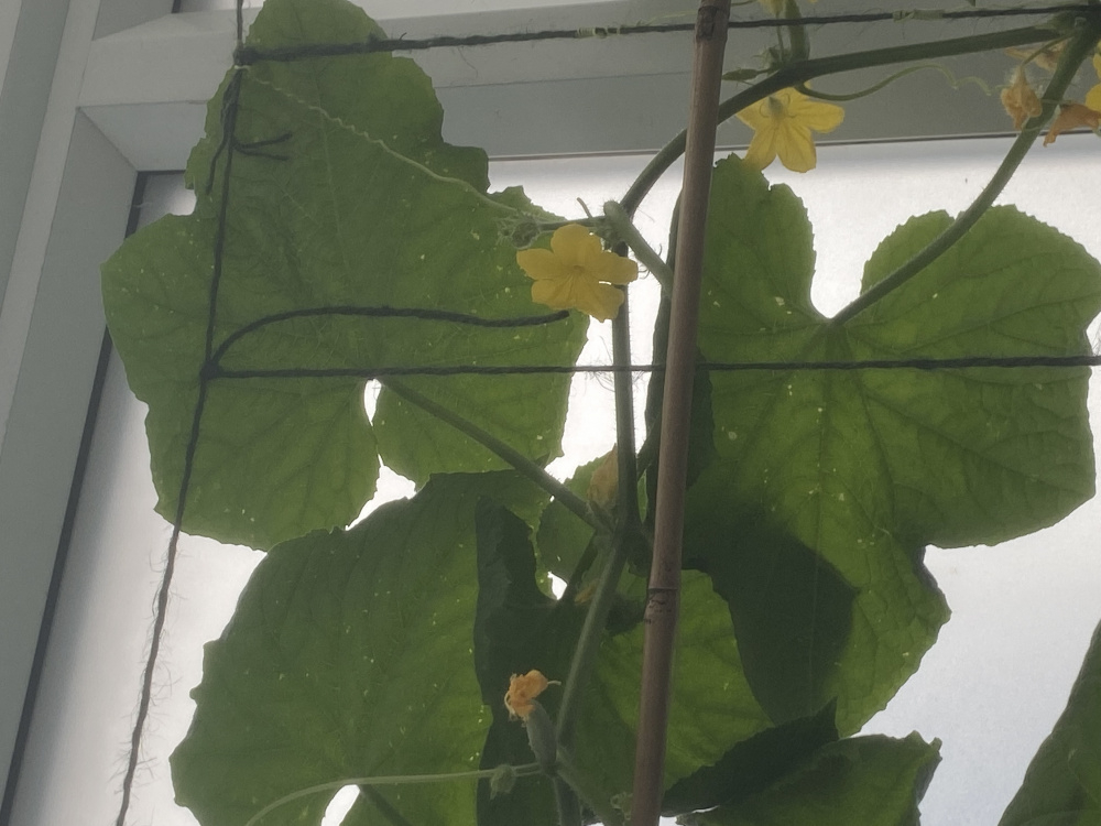 I'm growing cucumbers for the first time this year in a container. They are located in a sunny utility room (essentially a greenhouse on the side of the house) It gets rather warm in there as you would expect so the plants have been growing very quickly!