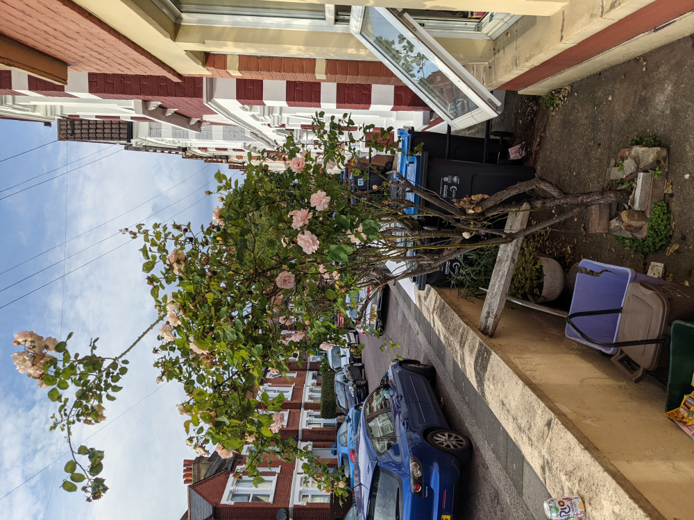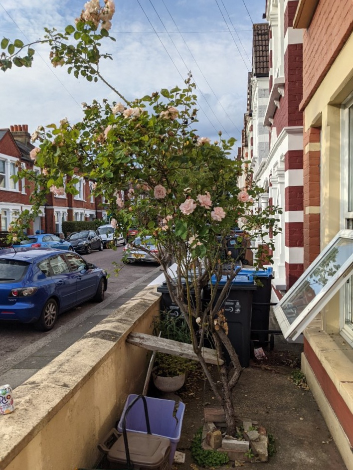 This (Rose bush??) Is in my front garden and as you can see, is in need of some TLC. It is currently supported by a timber wedged against the masonry wall. It's also a little out of control.