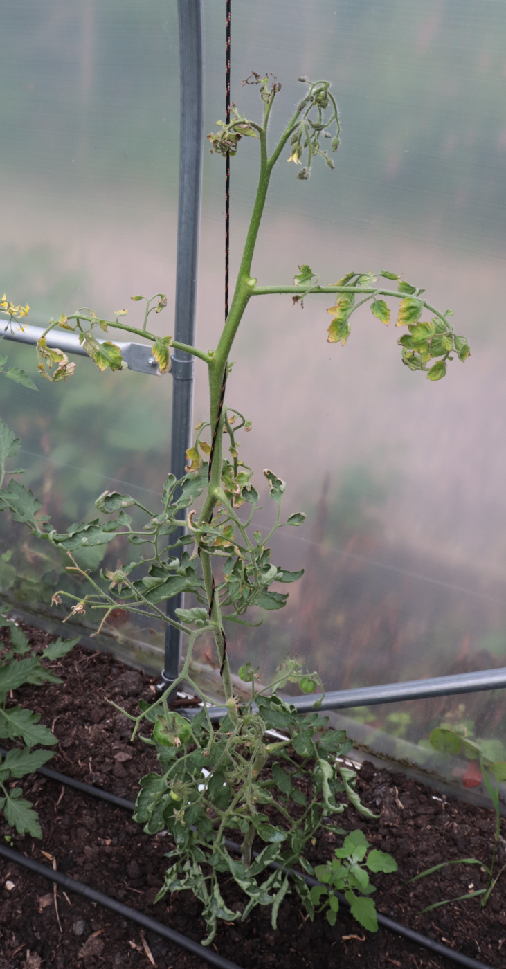 Hi All, Can anybody identify this tomato problem? In the past I've grown tomatoes outside in growbags, but this year I'm using my shiny new polytunnel. It has no-dig beds with a good 4" layer of organic farmyard compost. All was going well, but in the last week or so several of them (about 5 out of 17) have been hit with this problem - see pics.