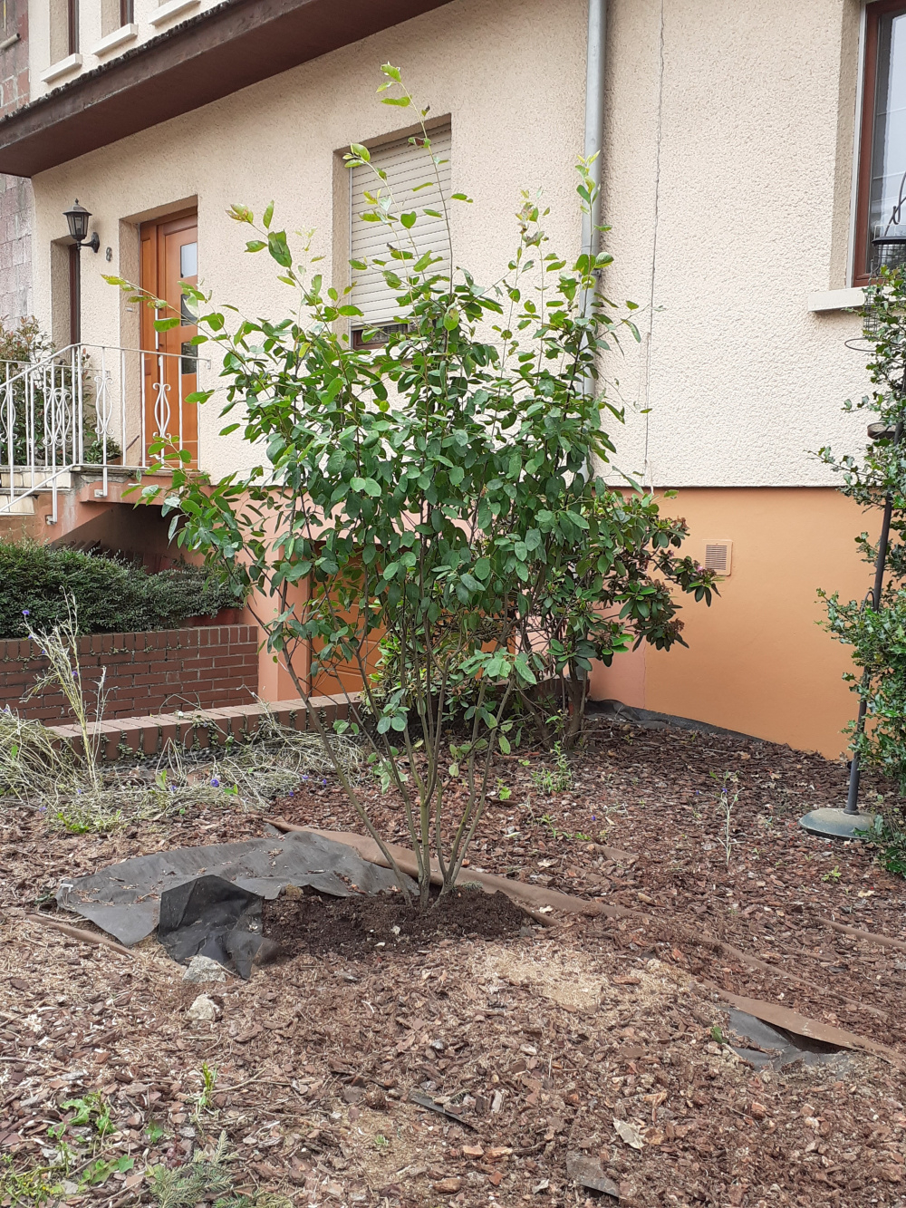 Progress! The conifer is gone and the Amelanchier is in! Should I lightly prune the straggly twigs on top? Please tell me if you see anything wrong in the planting.