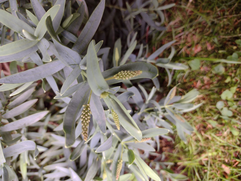 I don’t think those leaves are a Hebe, but it could be one I haven’t got or ever seen. They have a bloom on them, haven’t seen that on Hebe.