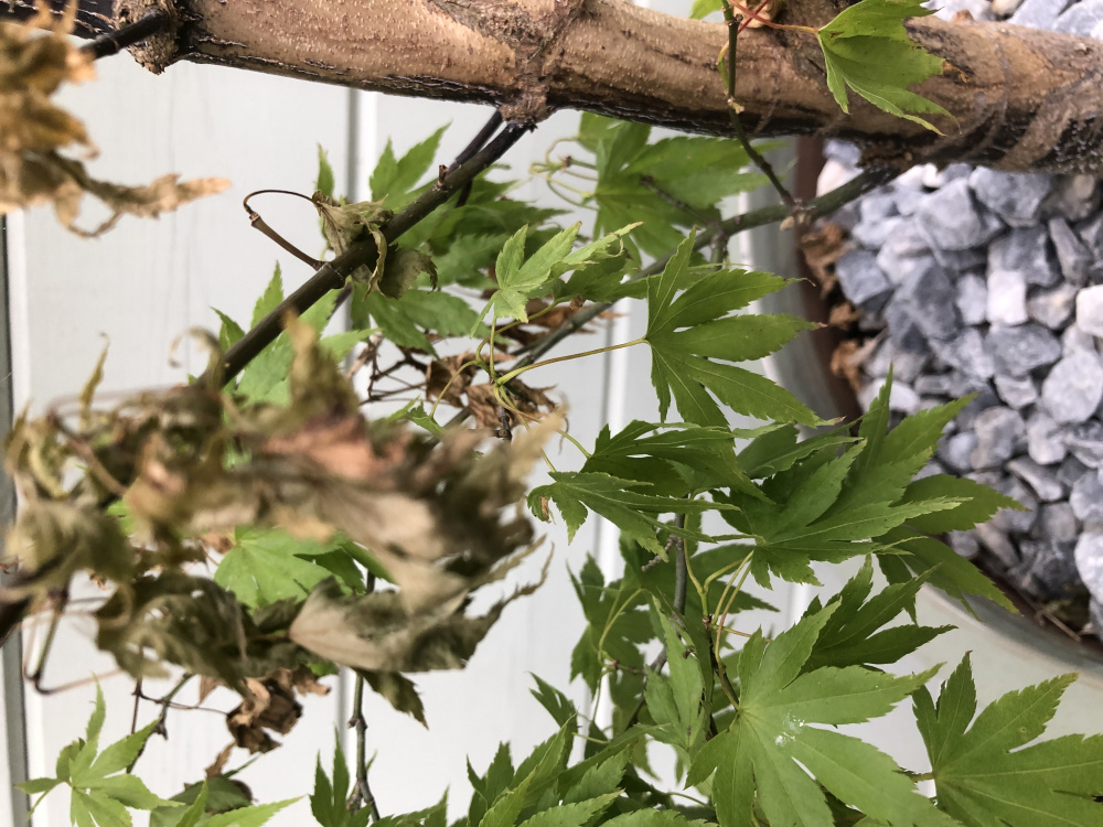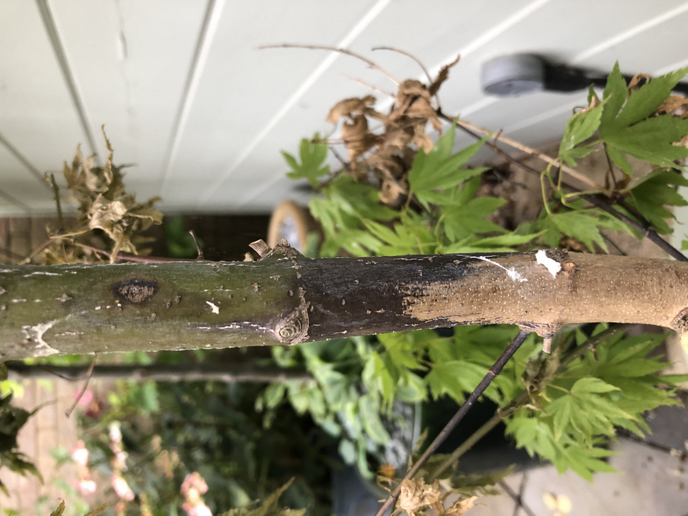 A fortnight ago my 8 year old acer was the picture of health now it looks like it's on it's last legs. It is out of direct sunshine and wind. The bottom 2 spindly branches have healthy leaves on them but above that the top 3 foot has just shrivelled. The stem has gone black and there is some white soft white marshmallow type debris on it - not like scale. Any ideas??