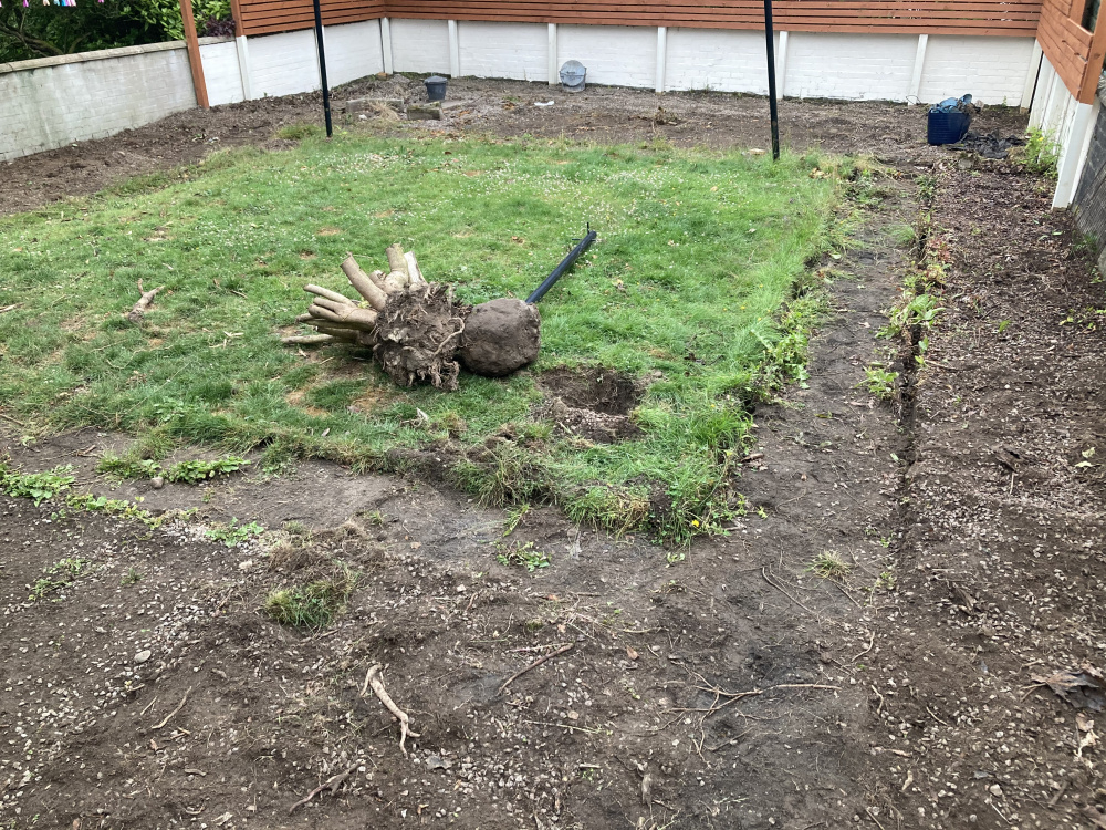 I've been working on my garden for the past 2 weeks. Previously had chuckies at the bottom and top of the garden, with large overgrown bushes to the sides and slabs/edgings around the perimeter of the grass.