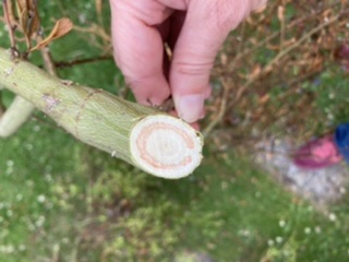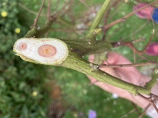 I think we have honey fungus in our garden but am struggling to find evidence. Our privet hedge died suddenly last year and our ceanothus has just died after flowering; I know both of these are highly susceptible. I dug up both and destroyed the roots of both but could not find any ‘bootlaces’ or fungus material between the bark and wood. The only unusual evidence (aside from the sudden death!) were pinkish circular rings on some of the dead ceanothus branches as per the photos.
