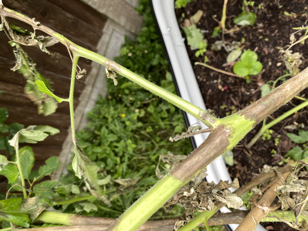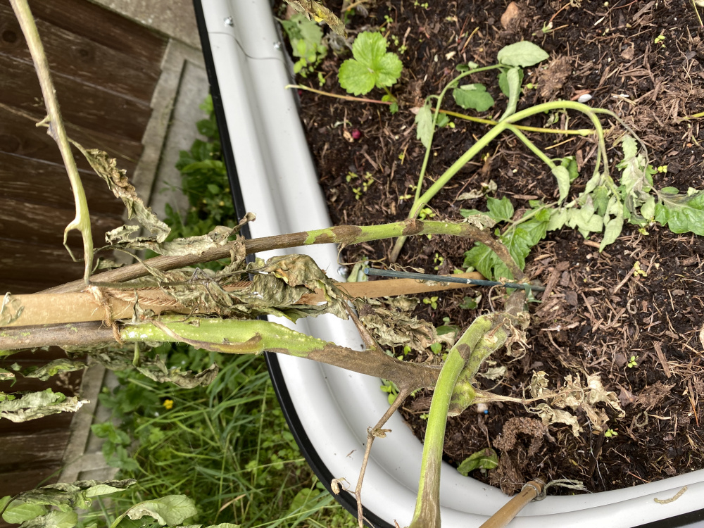 My four tomato plants have gone brown and need to be pulled up. They were planted in a new raised bed with a mix of soil from the compost heap and bagged compost. I have never grown tomatoes before, so how did it get here? And more importantly is there anything I can do to prevent it next year?