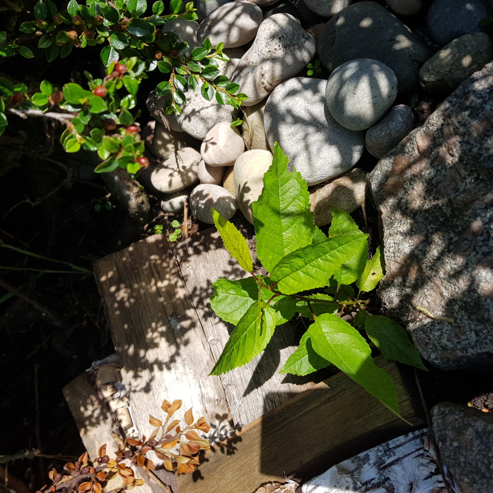 It looks like a sucker from a cherry tree root - or maybe a seedling from a pip dropped by a bird. If it's a sucker, you'll find the root it comes from, not far down under the surface. Try to pull the sucker off the root. If you just snip it off, it'll grow again!