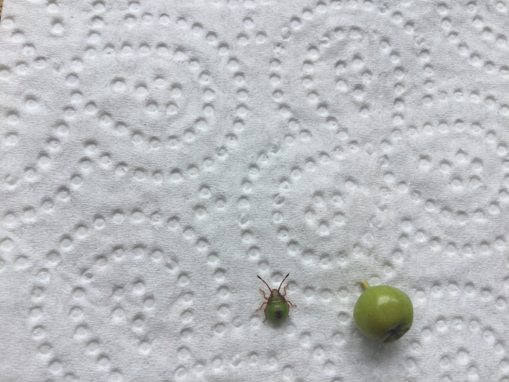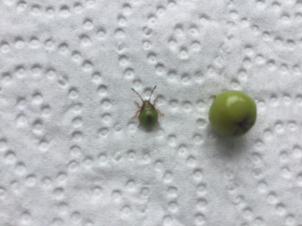 HI, Can anyone identify this bug which I found on my sorbus tree, as you can see it is about half the size of the unripe berry 4/5mm in lenth with a dark spot on its back making it almost invisible on the tree. any help would be appreciated.
