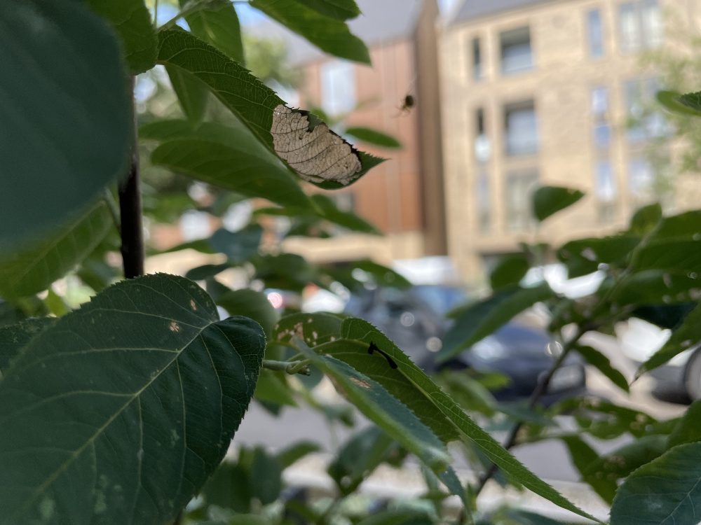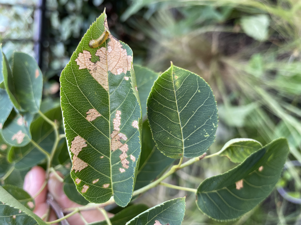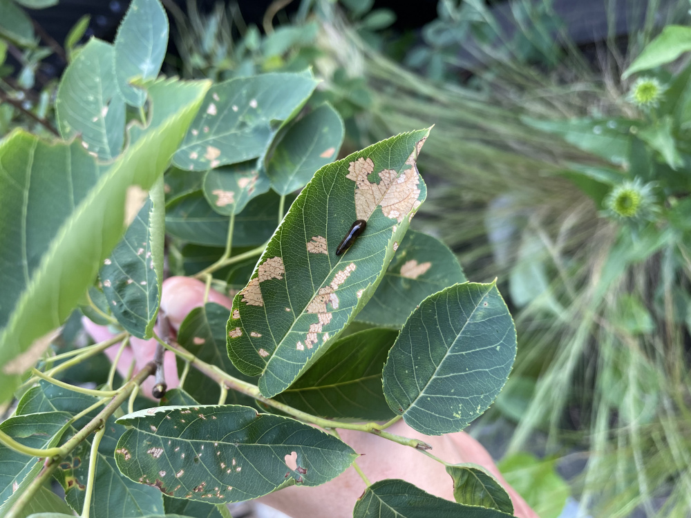 Something is happening to our amelanchier tree, the leaves are turning into skeletons! I found a couple of weird slug type grub things on the leaves too, one yellowy brown one and a black one. Does anyone know what this is and how I can help it recover?