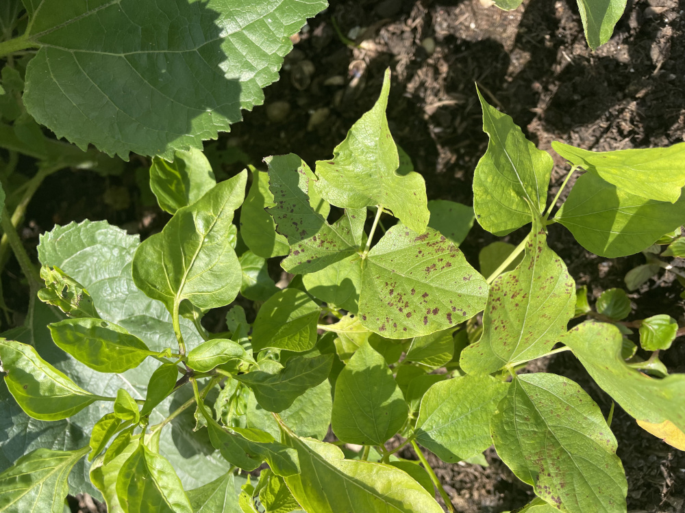 Can somebody advice what are this brown spots on my peppers and beans also my tomato plant is going yellow eith purple end in leaves is this blight marrow has been destroyed by slug and no female flower in courgette
