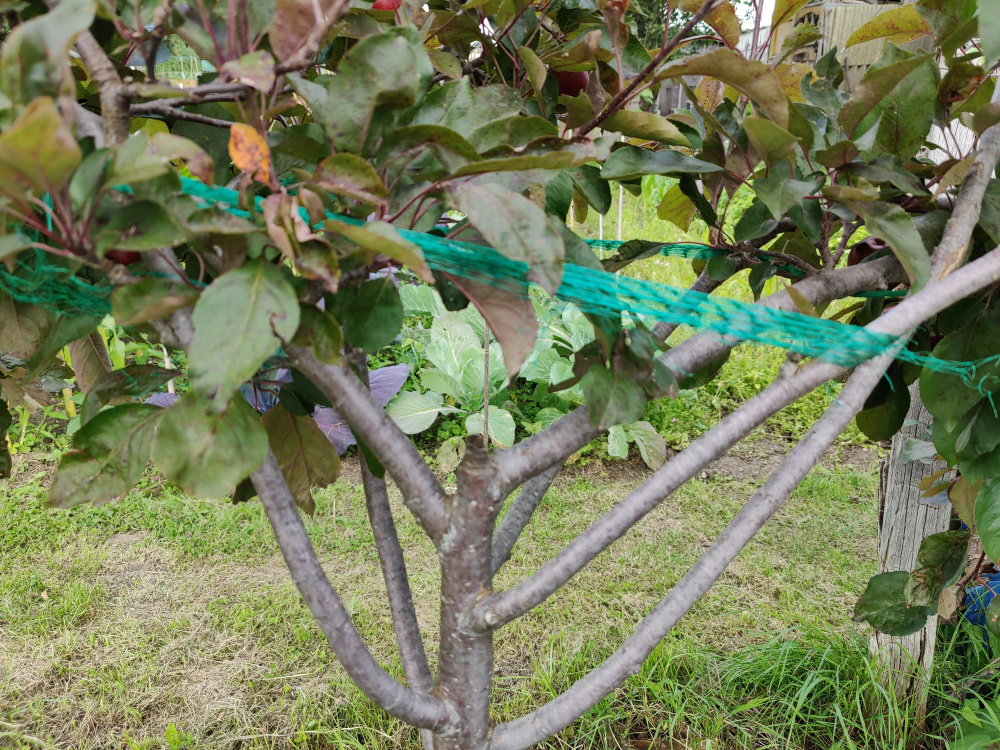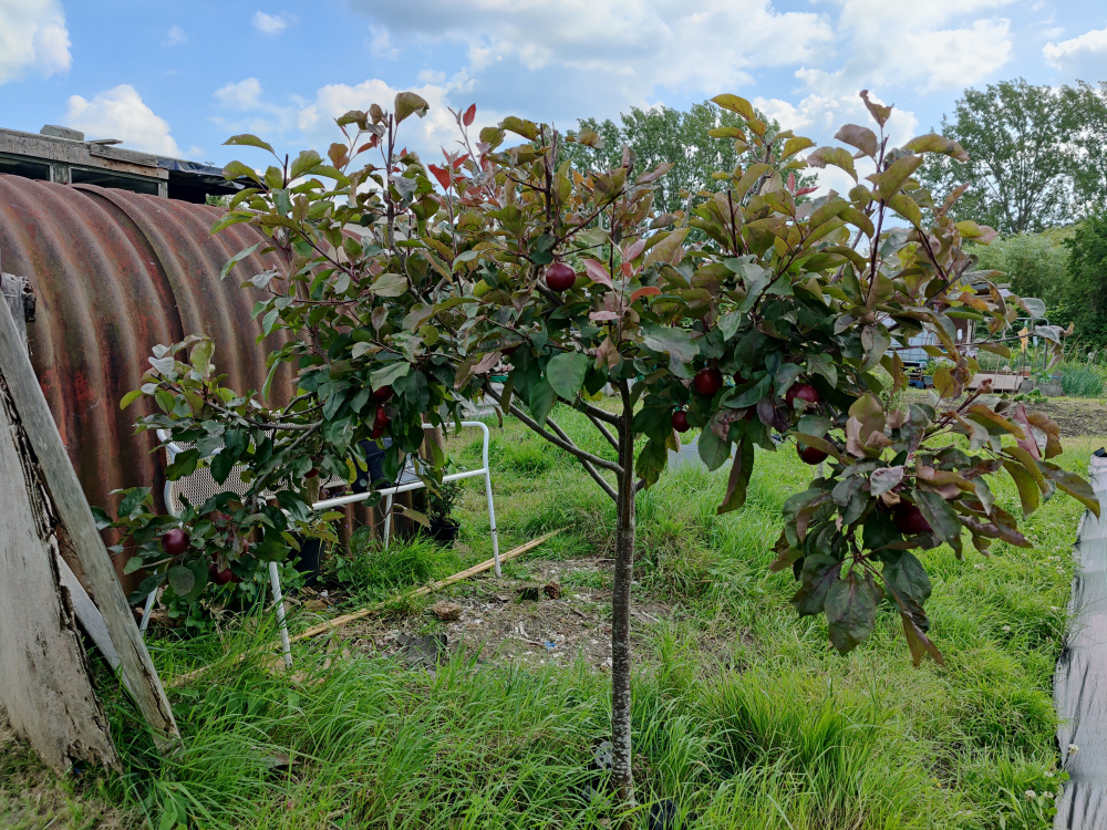 I've taken on an allotment half plot and have inherited an apple tree. It's a half standard tickled pink apple. Must have been in the ground since 2015 (so glad I found the label in the undergrowth) but it clearly hasn't been looked after much in recent years. Haven't got masses of experience with fruit trees so was wondering what you think I should do to improve its overall habit. Currently it has elongated sideways so the fruit are making the branches suffer under the weight. My instinct tells me to give it a serious haircut from the sides or do you think instead it would make sense to support it from below until the branches are stronger? As you can see someone tied it with some scrunched up netting to give some extra support 🙄