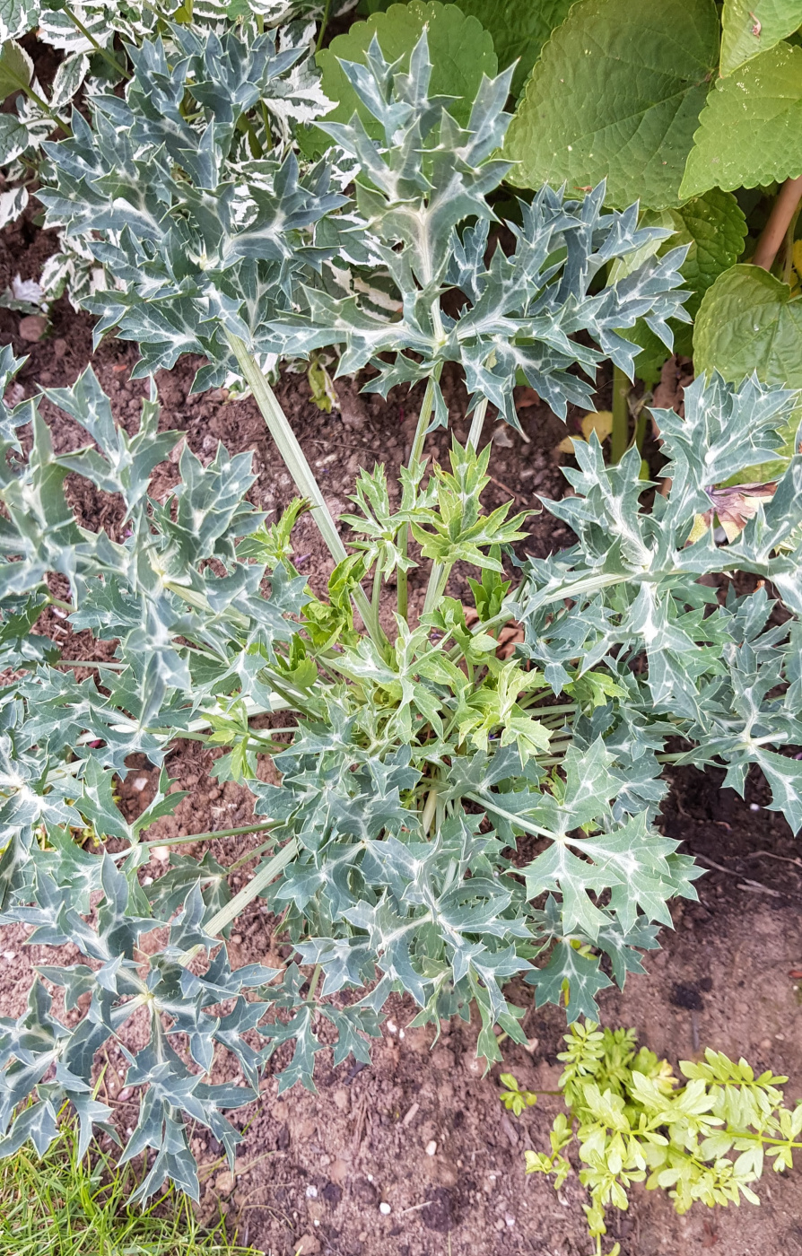 What do you think is going on with my Eryngium? It's showing no sign of flowering, and now it has new growth coming in the middle which is a different colour to the existing stuff, it feels a bit less prickly too. I got it around September last year in a 9 inch pot, overwintered in a cold frame. Should it be flowering this year or is too early? Does it need moving? It's in a sunny spot, which I thought it wanted!
