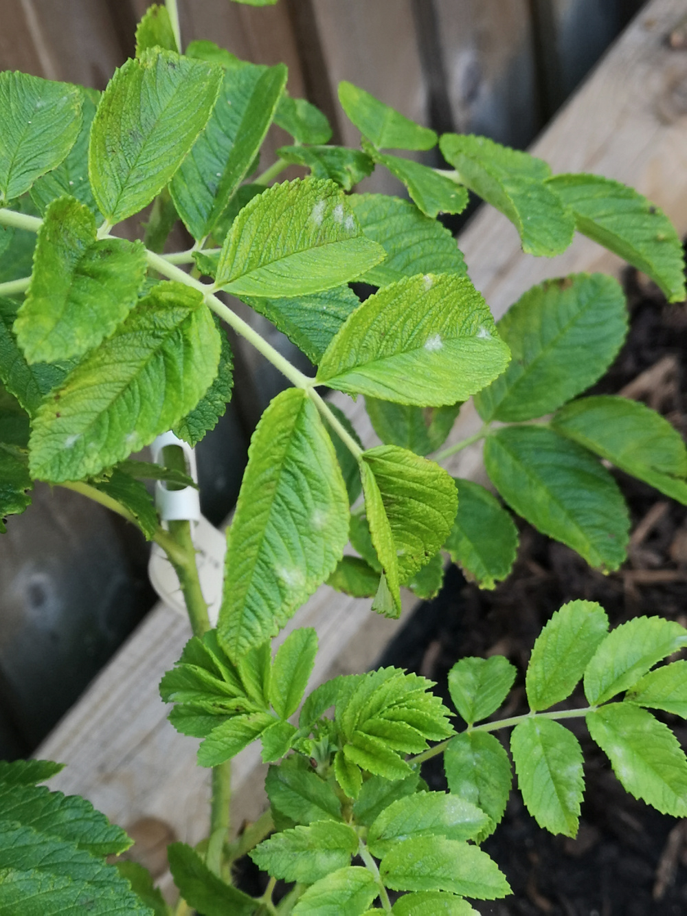 I had a Rosa Rugosa delivered last week and at first glance it looked OK. Then I noticed the discolouration on some of the leaves and what I assumed was powdery mildew. I chopped off the affected leaves but I haven't felt comfortable planting it in the raised bed (open bottomed). My concern is that if it's got a serious problem, I didn't want it to get too established and then be a PITA to get out (I planted a 9cm dwarf kniphofia and a year later when I tried to dig it out it the roots were horrendously large, I assume a rose would be so much worse). So, the plan was to pot it up to a 4l pot (currently in a 2l) and put that in the ground to keep watch with a view to planting it in the bed in the autumn (all being well). I've just been out and there are more specks of powdery mildew showing.