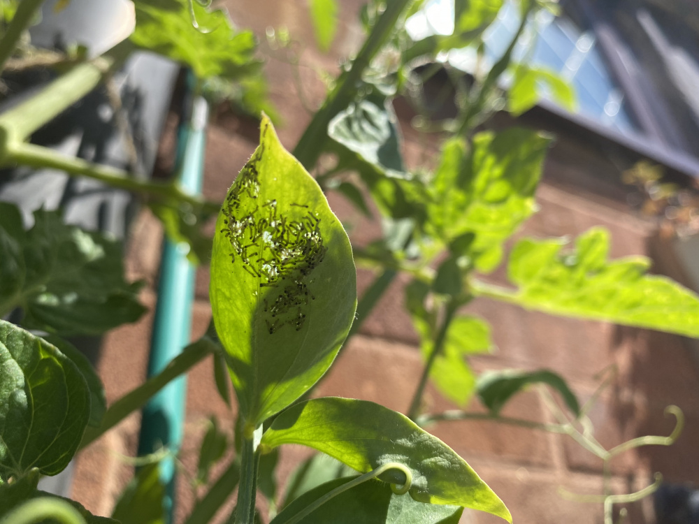 Hi, can anyone tell me what these are? They’re minuscule caterpillar looking bugs all on one leaf of a sweet pea… anyone know?