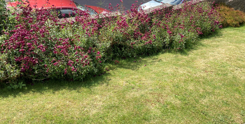 I would appreciate any views on how to change my front garden for the better. As will be seen from the photograph, my front garden is on a slope, mainly grass going down to a border full of penstemons. The grass has deteriorated over the years (mining bees digging holes and Birds-foot trefoil becoming established) and the border, originally with roses and other shrubs has become more difficult to maintain as I get older.