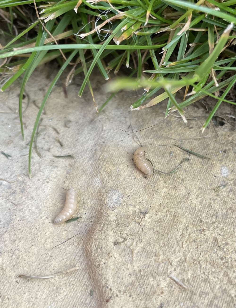 Can anyone help me identify what these small grubs are that are appearing out of the edge of our lawn please?