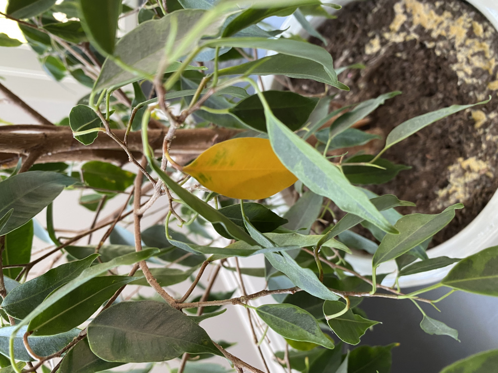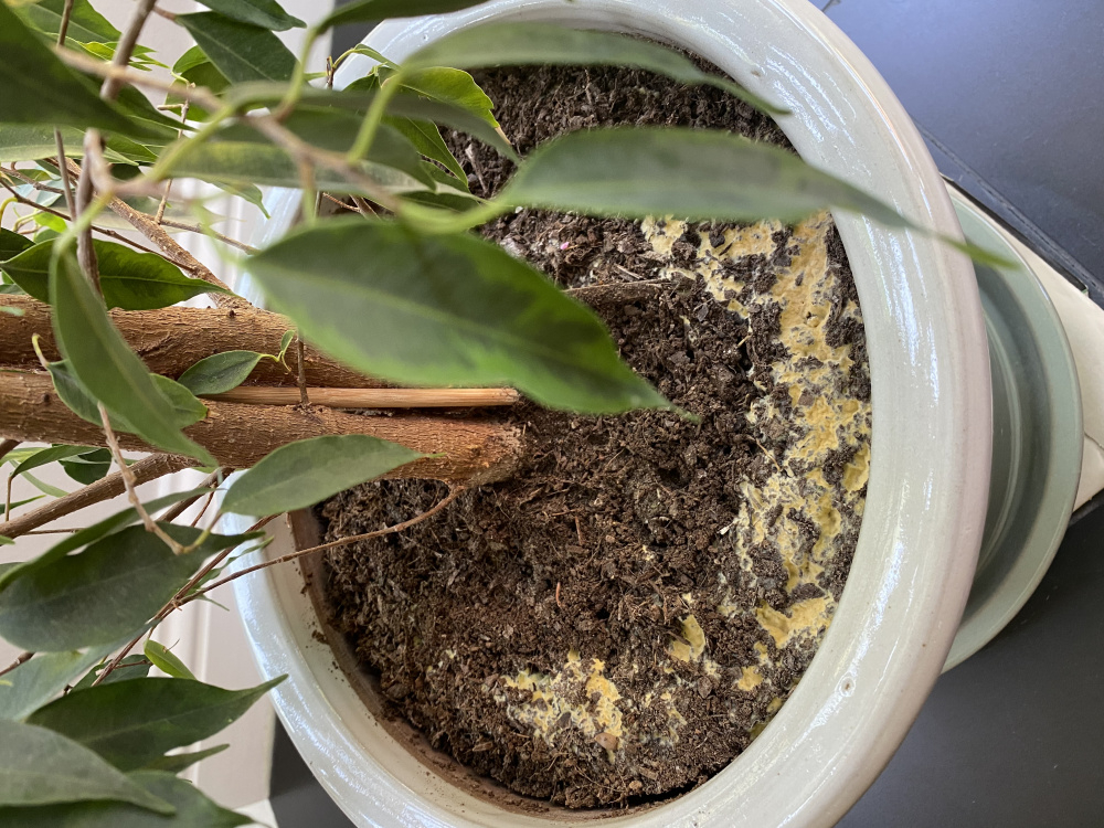 We have had this plant over six years. It’s done well and been repotted a couple of times. The last 2-3 years, this sulphur coloured growth appears on top of the soil. Even when completely repotted, it returns after many months. Occasionally, the plant sheds a few leaves. New compost always makes it seem healthy again.