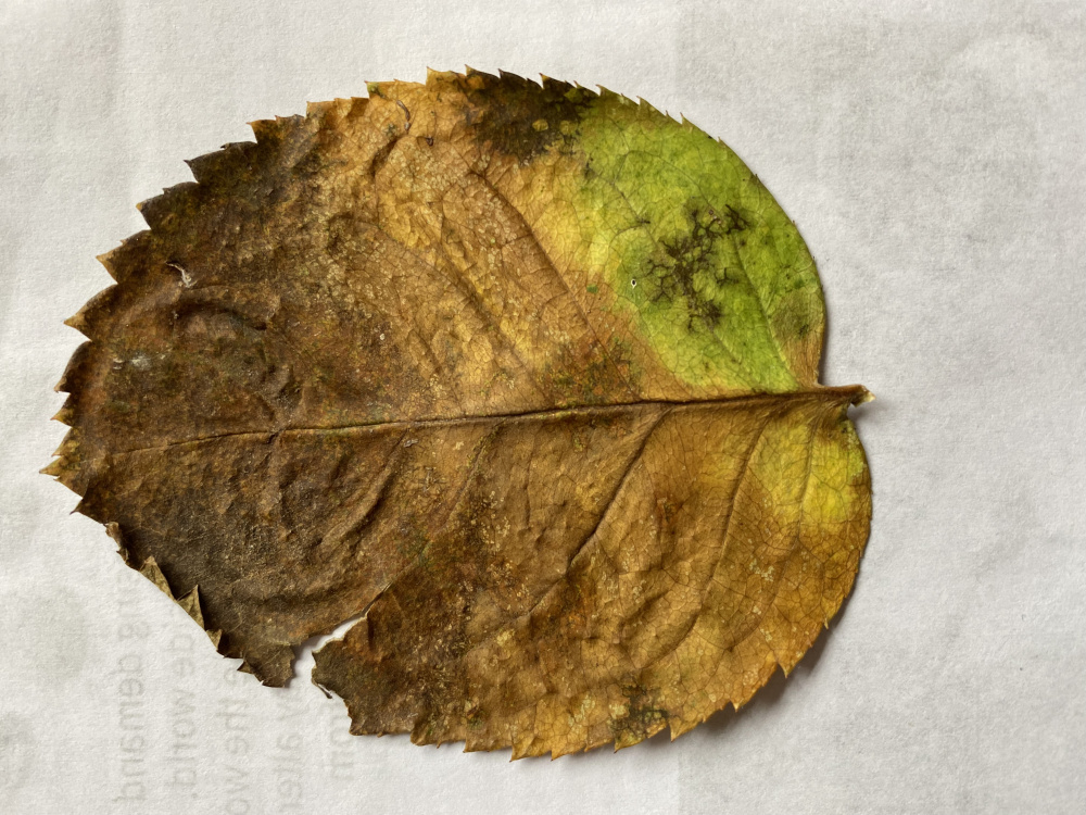 One photo shows the rose 'Emily Bronte' and the other shows a leaf from that rose. I assume it shows some form of deficiency but I do not know what. It is in a raised bed filled as directed and fed with tomato food and Miracle Gro alternately about every 2 or 3 weeks when I remember. It has grown and flowered well with some green fly which I rubbed off, no pesticides used. It is watered regularly. Can anyone help please?