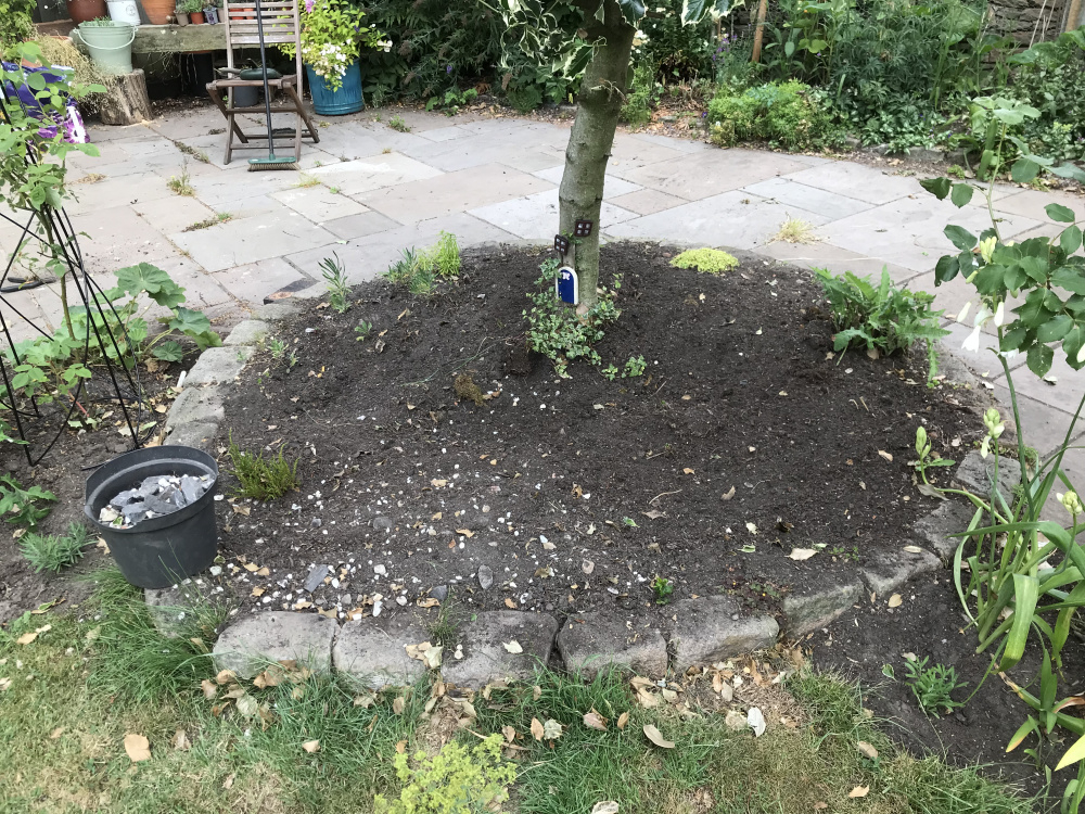 I have a small teardrop flowerbed (approx 2m in diameter) in the middle there is a very old holly tree. I really would like some ideas for a planting scheme. My previous attempts have not had the desired effect. It gets a fair bit of sun during the day but does get very dry. Any ideas please??