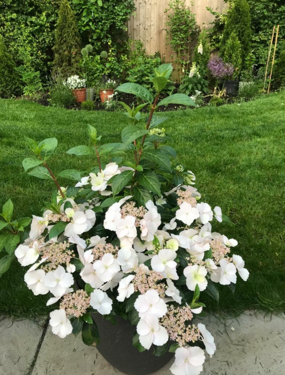 I bought this hydrangea a couple of months ago from a daily newspaper. All ads show them grown in pots so I put mine in a fairly large pot. It's in full morning sun on the patio then shade afternoons. Seems to be doing well, is watered every day. Lots of blooms showed from the base but now foliage seems to have taken over smothering the blooms. Is it ok to cut the foliage back to expose the flowers.