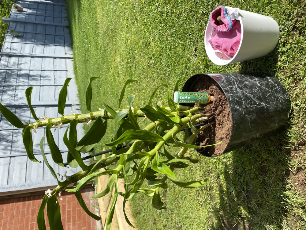 I have a beast of an orchid that my friend bought me, I’ve had it around three months and it is growing like crazy. I’ve repotted it today as it’s completely climbing out of it’s original pot (see pic for side by side comparison!) I realise I need to get it some proper orchid compost (it’s on the way) but needed to do something for now as it started to look sorry for itself!