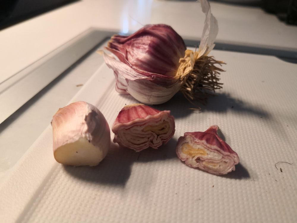 Photo is my garlic bulb in background, one of my cloves cut in half and a supermarket clove cut as a comparison. Use a lot of garlic and was really looking forward to using my own
