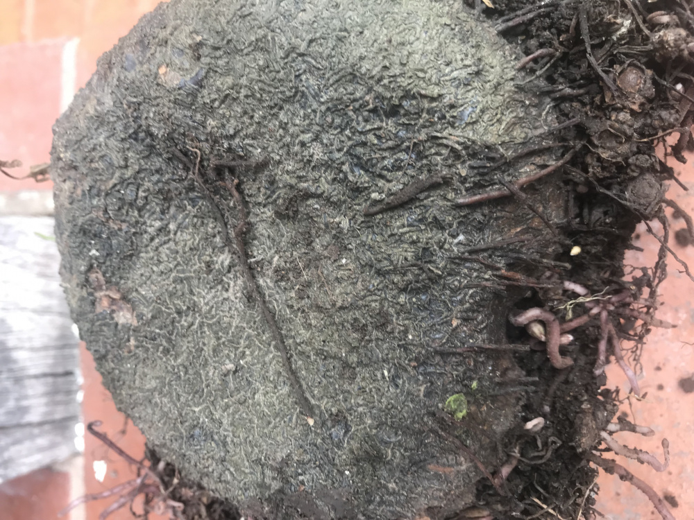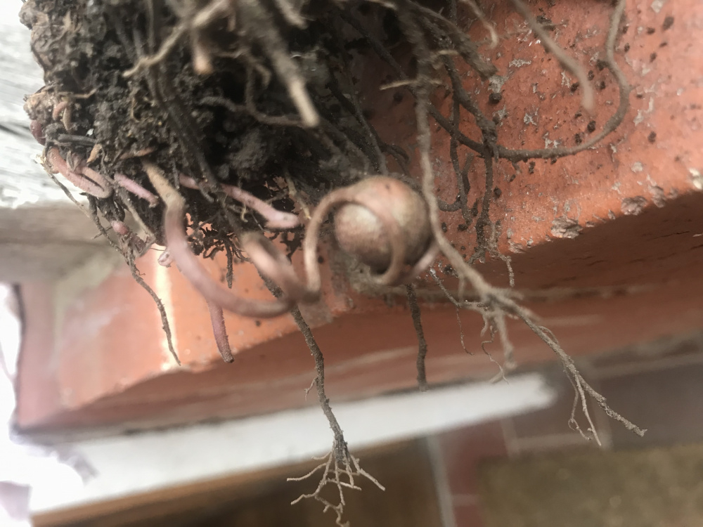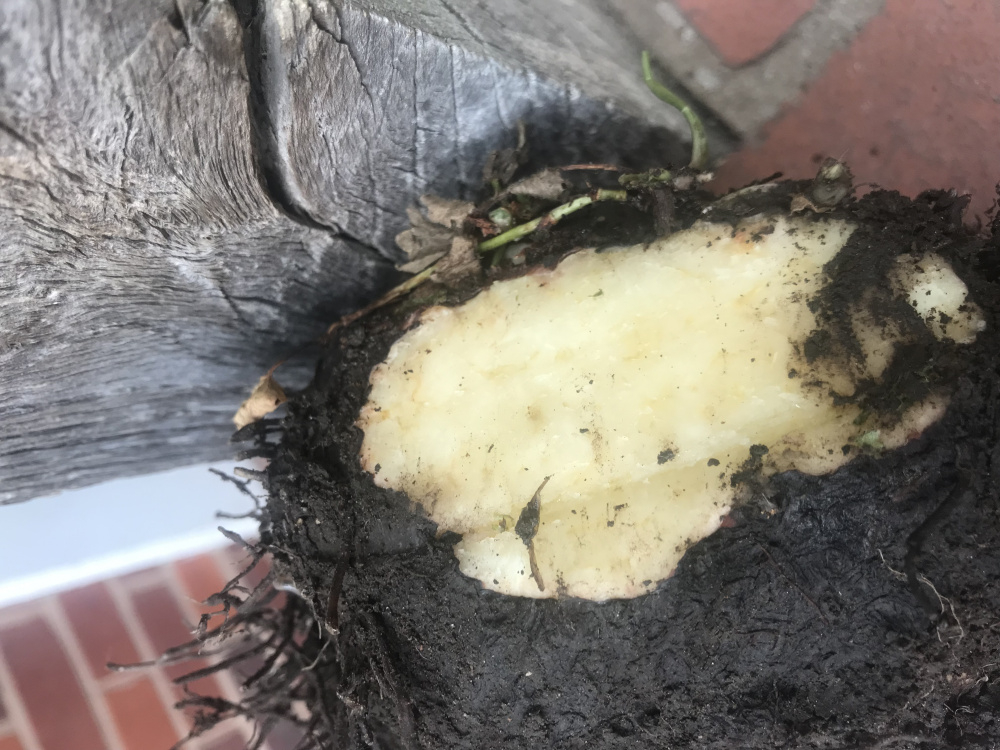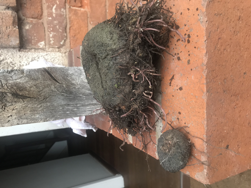 At the front of the house growing, in the gravel are these flat black disk type things. They vary in size and are easy enough to dig out as the roots on the bottom are quite small. Some have curly bits with round balls and when you cut the disk open it looks almost veg like.