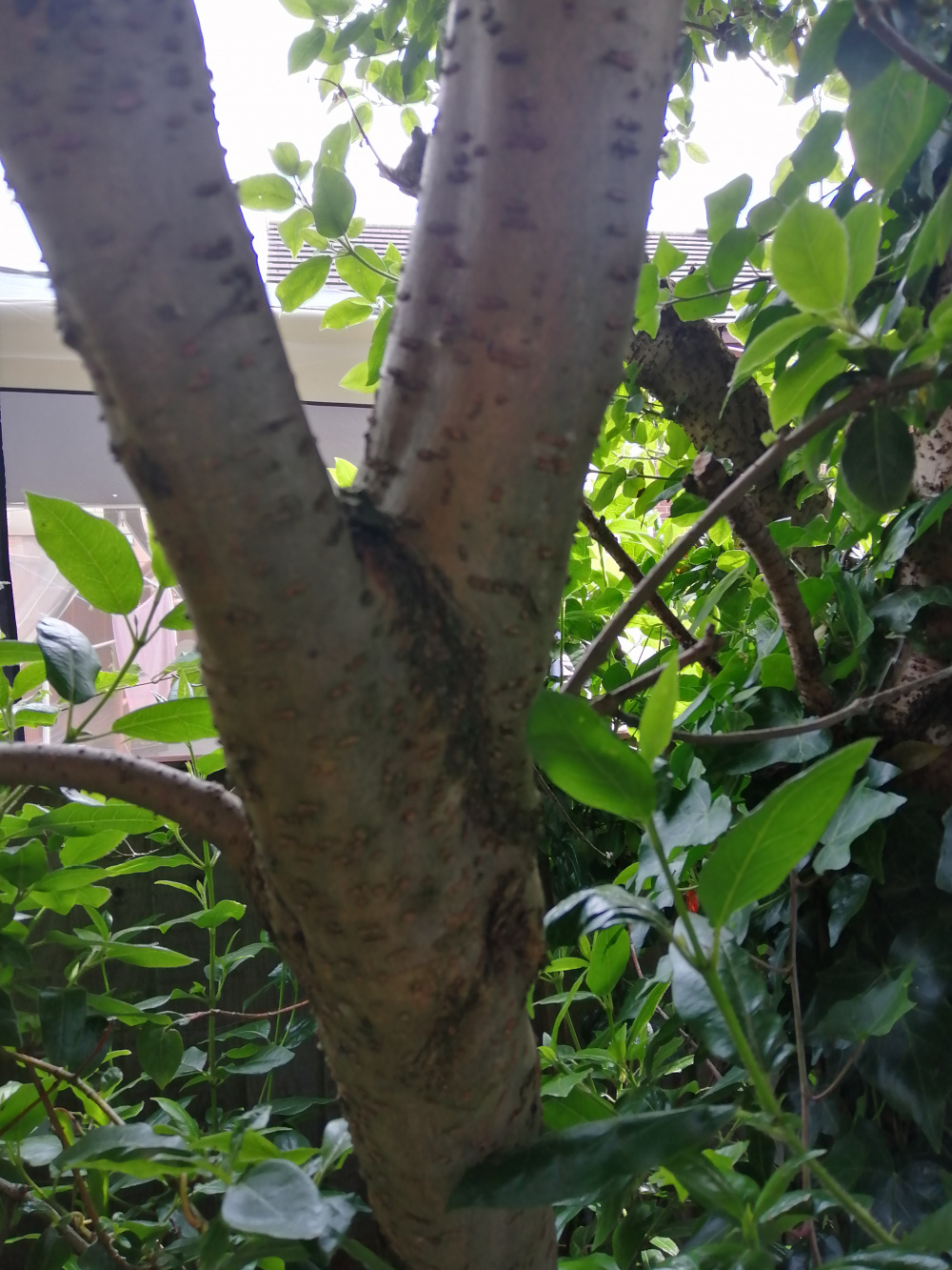 4m tall, leaves dark green, glossy, in pairs, smooth edges, spear shaped. Bark varies, rough on main trunk, smoother on young sprouts, with small horizontal dashes, Colour greenish grey.