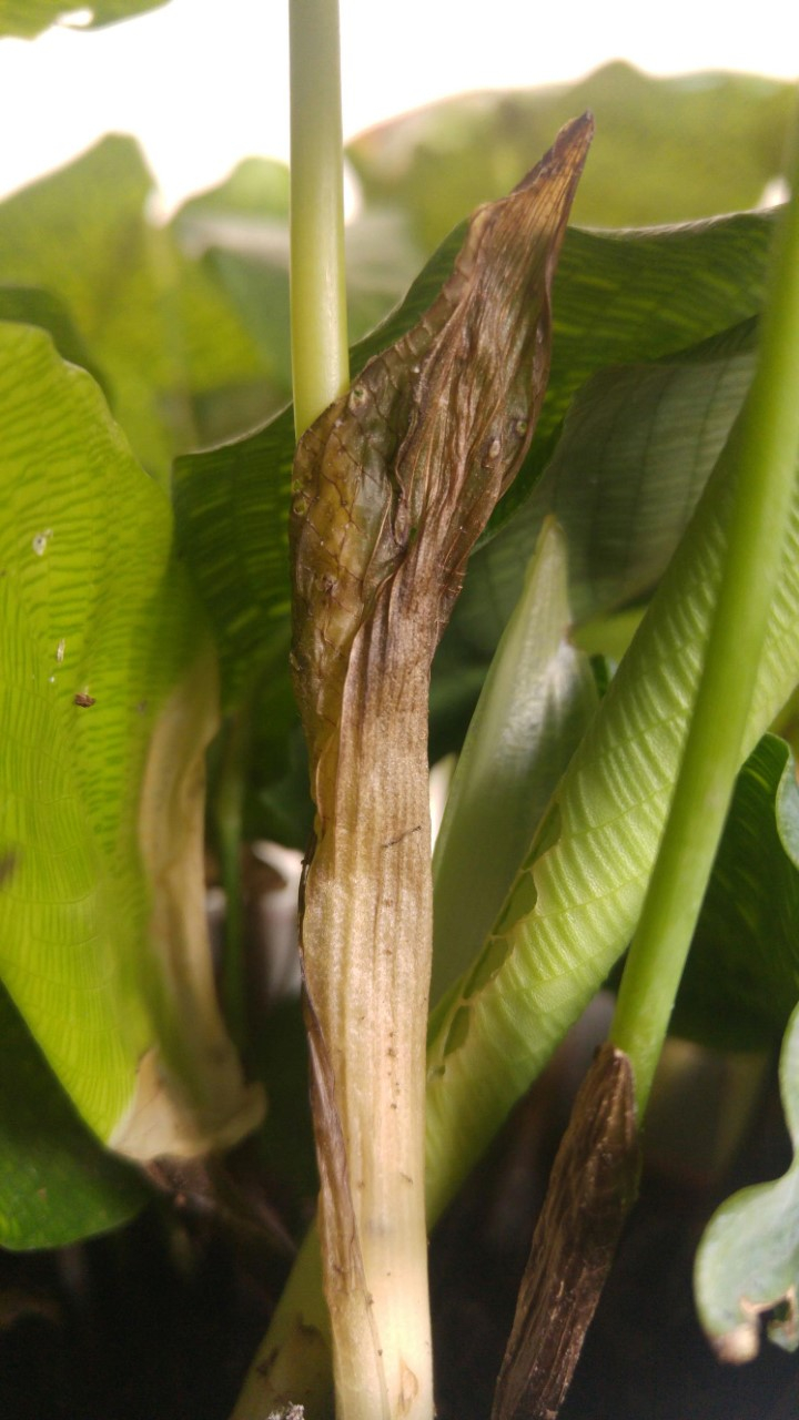 You can see a close up of a growing leaf to the right, where it already looks like there's holes developing in it even before it's unfurled (also shows a pretty bad small leaf to the left which I guess may just need cutting out):