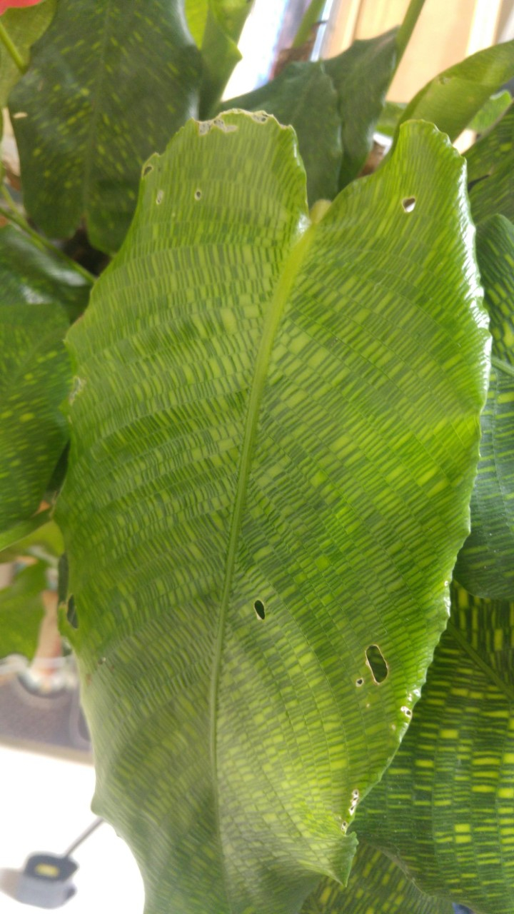 The 'ragged' leaves - holes in and around the edges, new growth slightly paler than the original leaves: