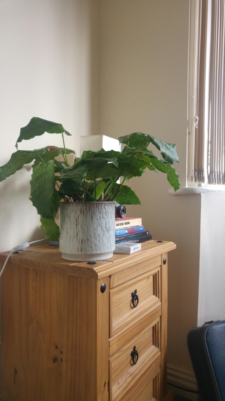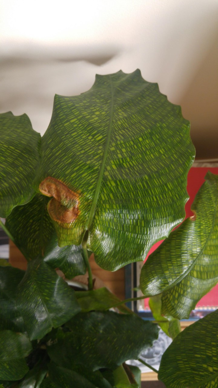 When it arrived a few of its leaves had yellow/brown marks on them, almost like cigarette burns. Since then, the marks may have grown slightly (although it’s hard to say for sure because I didn’t take photos at the start), but also some of the new leaves have turned out paler than the main growth, and ragged, almost as if something has been eating them.