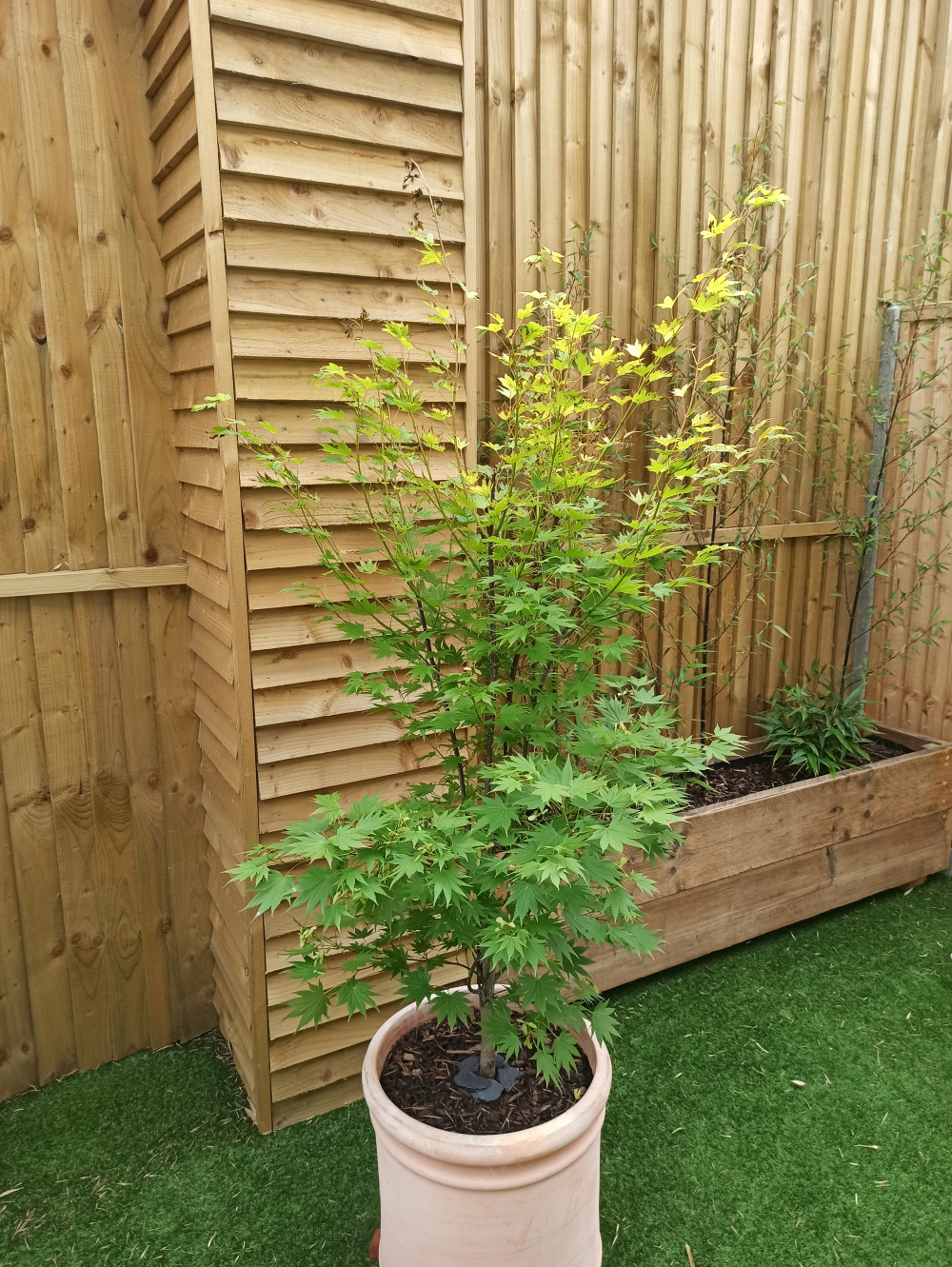 My wife and I recently bought a beautiful Acer Shirasawanum Jordan tree from our local garden centre and are growing it in a pot in our south-facing courtyard garden. Being very compact with a 12 foot fence at the rear, the garden is fairly sheltered with around half of it in shade at any given point in the day, with most of it receiving a dose of sunshine as the sun journeys across the sky. Our Acer is protected from some of the sunshine by the surrounding fences, but the leaves at the top have experienced fairly consistent sunshine as they remain exposed to the sun whichever angle it's coming from. Moreover, while there is a certain amount of shelter from wind, we've noticed it can still get quite blustery when the weather picks up.