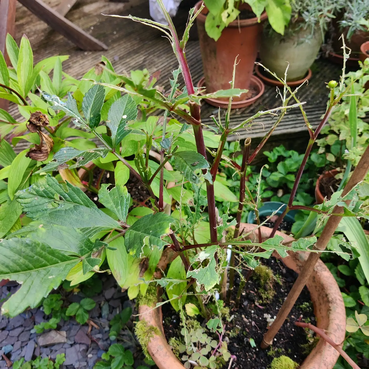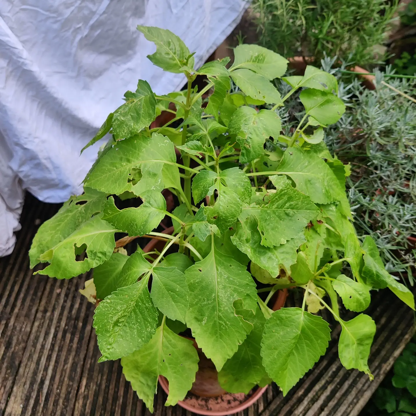 Something has totally stripped the leaves of one of my dahlias but I have no idea what has done this. I suspect the very ungraceful wood pigeon that frequents the garden. I've a second potted dahlia less than a meter from it which is almost unscaved.