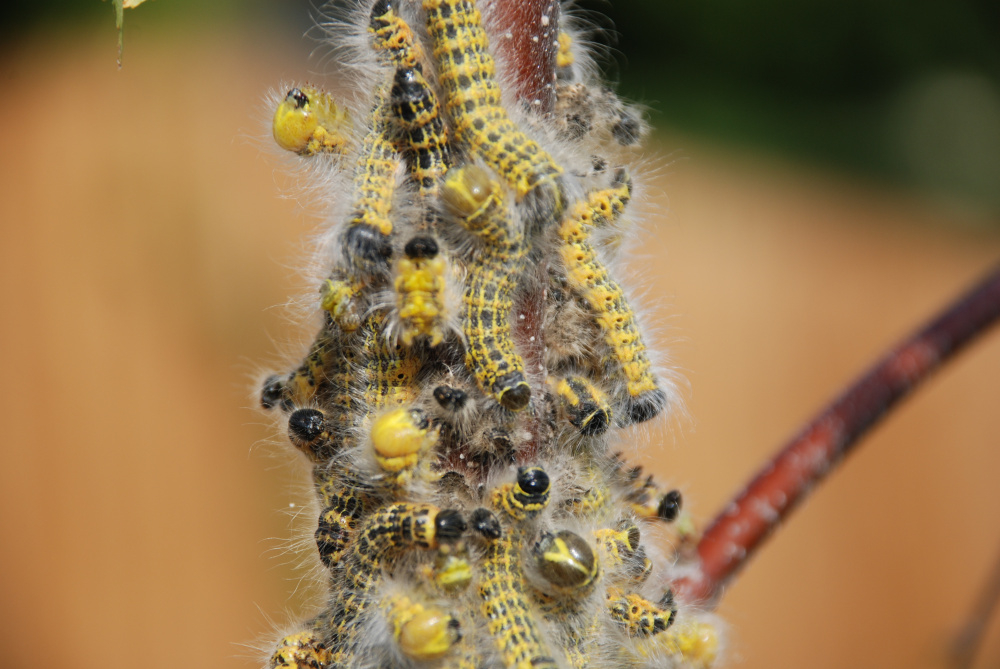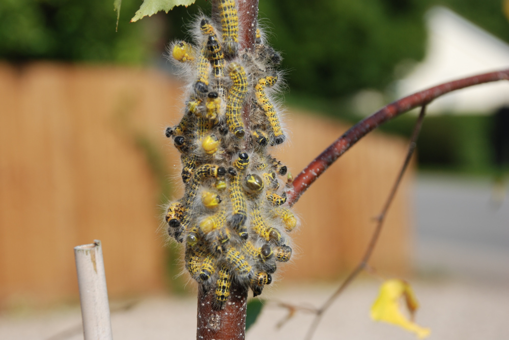 Are these Cinnebar moth caterpillars? All in a mass on a very young silver birch. Are they likely to cause damage?