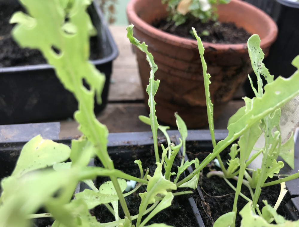 I thought the little holes in my rocket seedlings were probably flea beetle, but as you can see some of the leaves have now been stripped almost to the spine overnight. Is that also flea beetle? It isn’t slugs or snails.