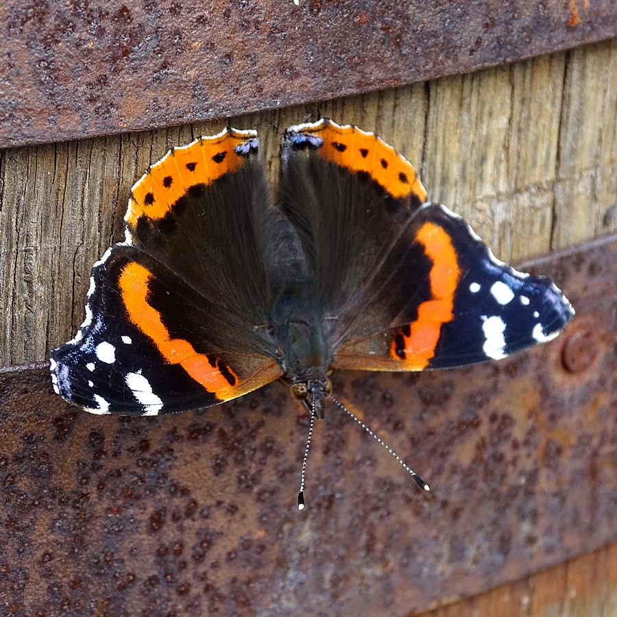 Here is a pic of a lovely upside down Red Admiral sunning itself on the water butt.