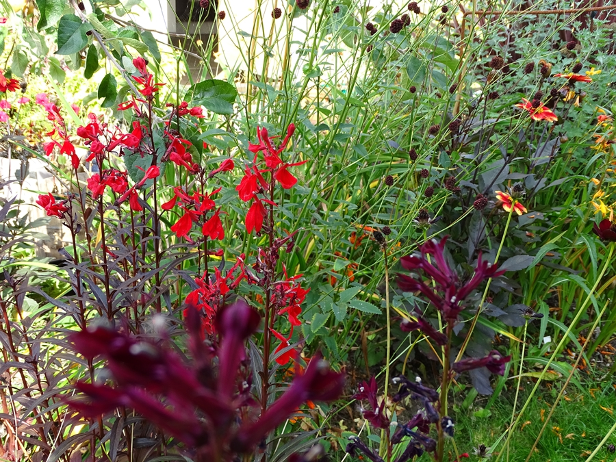 Was going to do some gardening today but ended up just doing a bit of deadheading. But I did take some pics. This little border is the one that's pleasing me most at the moment: Lobelia Queen Victoria and Lobelia Sparkling Ruby with sanguisorbia officialis, chocolate cosmos (not in the pic) dahlia and some crocosmia peeking in. @Hostafan1 - the serenity prayer might help. Or just getting in the car and shouting your head off. Either way - hugs to you. Behind it is the veg plot which really ought to go into the shame thread. We've had some nice french beans but the caulis got eaten, I never planted out the kale or the beetroot and the courgettes have been pathetic.