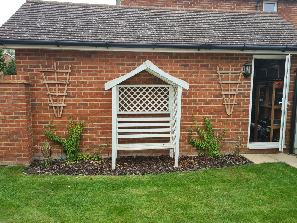 The arbour is actually much whiter than it was ever intended to be! It does tie in with the white garage door, but it was supposed to be a cream colour - but the paint ended drying up a very bright white